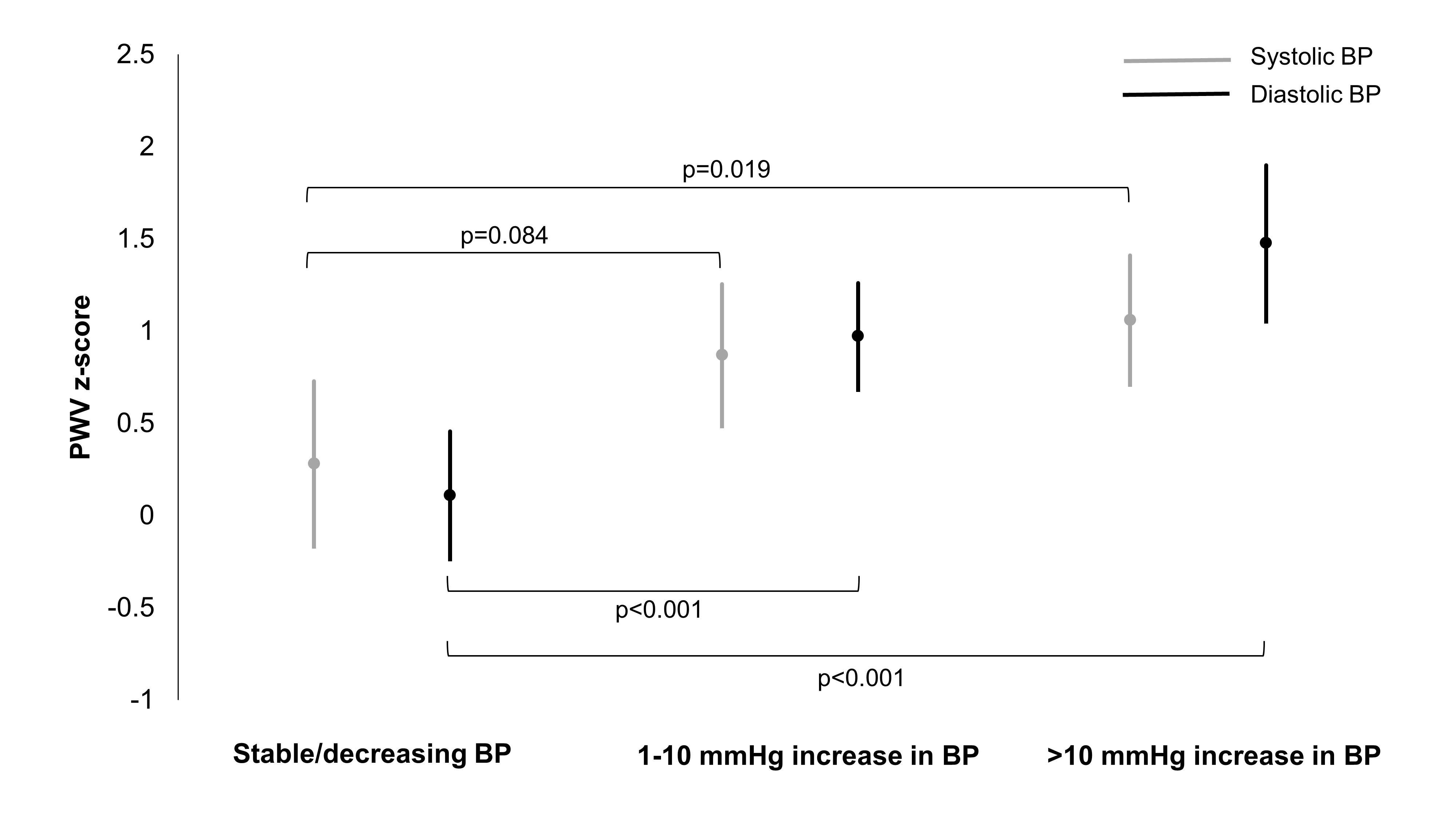 Methods: We included 70 children (n=43 males) from a longitudinal prospective study with biannual visits at three German pediatric nephrology units (Essen, Hamburg-Eppendorf, Hannover). All participants were ≥2.5 years post-transplantation with at least two PWV measurements. Changes of systolic (ΔSBP) and diastolic BP (ΔDBP) from the baseline values were classified into “stable/decreasing”, “1-10mmHg increase”, and “>10mmHg increase”. Linear mixed models for PWV z-score (PWVz) adjusted either for ΔSBP or ΔDBP were performed. Extended analyses were performed for SBP and DBP z-scores in a dataset with monthly entries of BP, immunosuppression, and creatinine from 35 children (n=20 males, median follow-up of 74 months, person-visits n=2137).