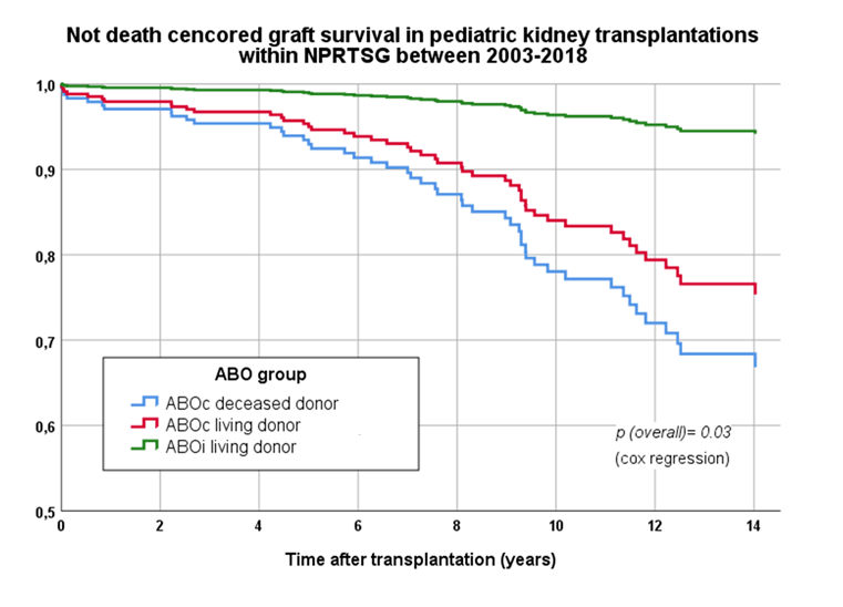 Conclusion: Our findings suggests that pediatric ABOi LDKT is comparable to ABOc LDKT and superior to DD kidney wait listing. We did not observe any significant increase in mortality, graft failure or complications. In fact, graft survival was the highest in the ABOi LDKT group and the incidence of malignancy 0%. ABO-incompatibility should therefore not impede living donation. Finally, if the favorable outcome of ABOi LDKT is ascribed to a protective effect of rituximab induction in pediatric patients calls for further investigation.