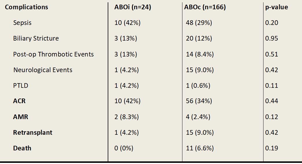 Method: A retrospective review of patients aged 0-16 years inclusive who had received ABOi Liver transplants from 1986 to 2020 at the Children’s Hospital at Westmead, the Paediatric arm of the Australian National Liver Transplant Unit, Sydney, Australia. Comparison of post-transplant outcomes between first-time ABOi and ABOc recipients was made between 2008-2020.