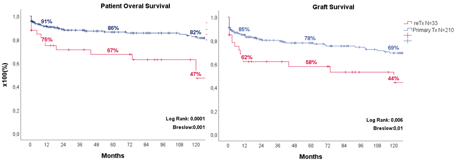 Results: A total of 243 Tx were done, 210 (86%) were primary Tx, 29 were re-Tx and 4 had a 3rd Tx, and 122 (50%) were female. The median age was 33 months (R=1-208), median weight was 13 kg (R=4-74 and z score weight for age -1.07 ± 1.5) and mean height of 100±35 cm (z score height for age -1,7 ± 1,8). Indications for Tx were: 88 (42%) biliary atresia, 33 (16%) cryptogenic acute liver failure, 24 (11%) fulminant viral hepatitis (HAV), 15 (7%) autoimmune hepatitis, 14 (7%) Alagille`s syndrome, 17% others. Re-Tx. were performed due to: chronic ductopenic rejection in 12 cases, arterial thrombosis in 7, primary graft dysfunction in 7, biliary complications in 4 and others in 3. The mean time on the waiting list for cadaveric Tx was 81 ± 191 days, mean post Tx hospitalization was 28±24 days (12±13 ICU and 15±19 general ward). One hundred fourteen (47%) Tx were performed with living donor; 129 (53%) with cadaveric grafts, of them 61(47%) with partial graft. The mean cold and warm ischemia time were 250±245 minutes and 44±42 minutes respectively: 402±127* and 45±17 minutes for cadaveric donors and 85±67* and 43±12 for living donors of cold and warm ischemia time (* p=0.001). The most frequent surgical complications were: 49 (20%) biliary (30 leaks and 19 strictures), 14(6%) hepatic artery thrombosis (11 early and 3 late), 10 (4%) portal vein (8 thrombosis and 2 stenosis), the remaining 10% were other complications (postoperative bleeding, acute ventral hernia, surgical wound infection, peritonitis); 14 (6%) cases of PTLD. Figure 1 shows patient and graft survival at 1, 5 and 10 years for those who received primary Tx and re-Tx. Figure 2 shows patient’s survival divided in primary Tx and re-Tx.