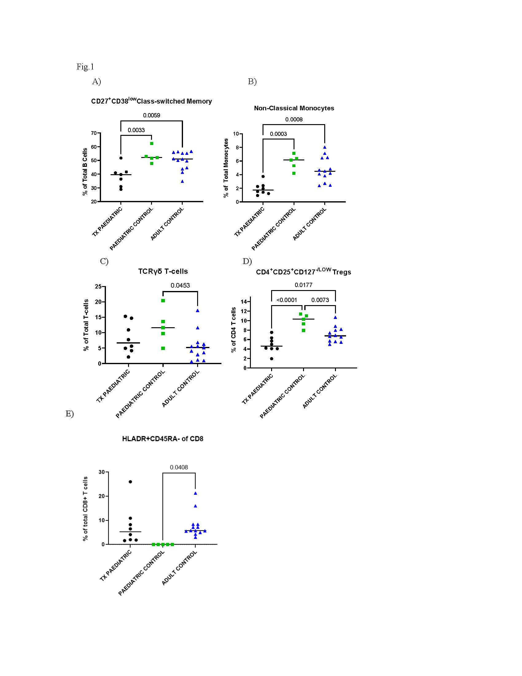 Conclusion: Immune profiling by multi-colour flow cytometry revealed differences by ages and after transplantation and offers valuable insight into unique cell subset changes present in the transplant population that could be targeted clinically or to monitor patient condition.