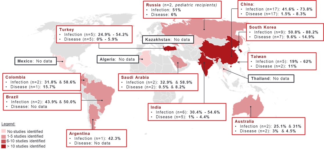 Results: A total of 63 studies (range: 33 to 10,206 patients), most conducted in adults (≥ 18 years; n=49 studies, 77.8%) and allogeneic HSCT recipients (n=53, 84.1%), were included in the review. In 43 of 54 studies reporting on incidence of CMV infection, within 1 year post-HSCT, estimates were uniformly distributed between 24.8% and 61.2% (Figure 1). Lower estimates were reported in autologous HSCT recipients (5.3%), and younger patients at the time of transplantation (9.3% in adults with a median age of 25 years and 18.6% in patients aged ≤20 years). Higher estimates (range: 69.4% to 88.2%) were found in 8 studies from China and South Korea, most with a follow-up period > 1 year (median: 27 to 54 months in 5 studies) (Figure 2). Incidence of CMV disease following HSCT was below 20%, with estimates uniformly distributed between 0% and 15.7% in allogeneic HSCT. According to 11 studies, reported rates of CMV recurrence ranged between 19.8% and 37.9%. Commonly reported risk factors for CMV infection or disease in HSCT recipients were high-risk CMV serostatus (R+) (hazard ratio [HR]: 2.6 and 3.7, odds ratio [OR]: 2.2 and 5.4), older age of recipients (HR for each additional year: 1.03-1.04), presence of acute or chronic graft versus host disease (HR: 1.1-2.5), haploidentical HSCT (HR: 2.7-6.4), and use of immunosuppressive agents (OR: 5.0-9.3). CMV-related mortality was reported in up to 10% of patients following HSCT (n=30 studies; period of assessment not reported).