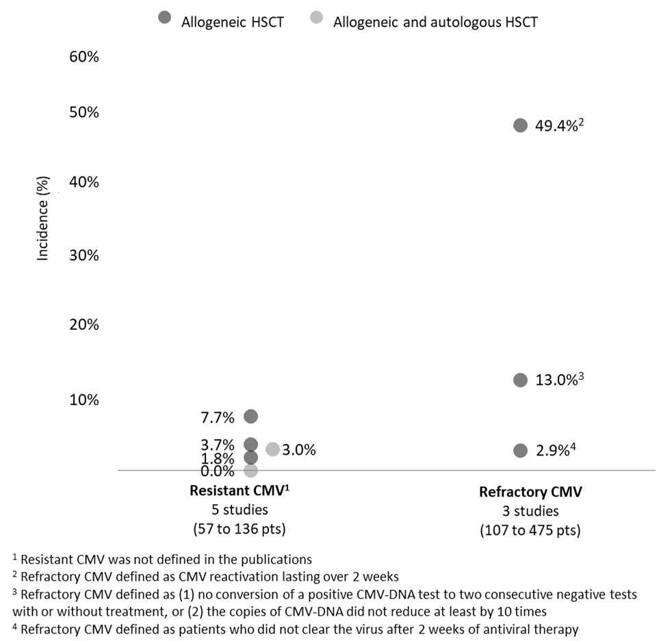 Methods: Information sources (search period: 01 Jan. 2011 – 21 Jul. 2021) included indexed literature (Ovid® MEDLINE and Embase, Cochrane Database of Systematic Reviews and World Health Organization database Global Index Medicus), conference abstracts, pragmatic searches of the grey literature and snowballing of references lists of retained studies. Observational studies of interest included HSCT recipients (any age) who developed CMV infection or disease in 15 selected countries in Asia-Pacific, Latin America, Russia, and the Middle East. Outcomes of interest were treatment patterns for CMV infection and CMV disease, proportion of patients (pts) with resistant and refractory CMV including definitions, treatment-related outcomes and adverse events (AEs). The protocol was registered in PROSPERO (CRD42020205559).
