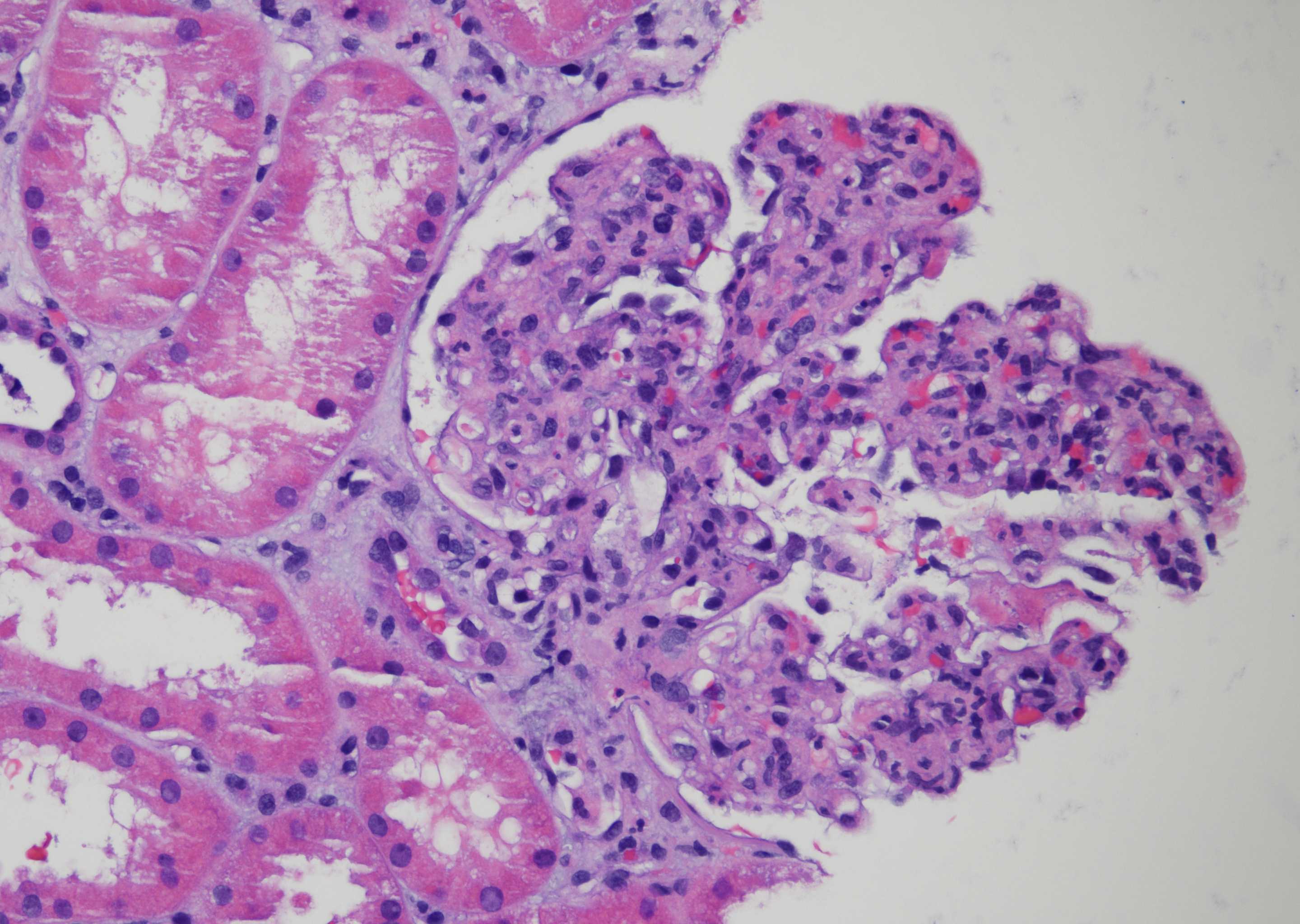 Results: Work up was notable for bartonella henselae bacteremia. He underwent an allograft biopsy that demonstrated post-infectious glomerulonephritis (GN); Mycophenolate was discontinued and treatment was started with rifabutin and doxycycline. AKI initially improved, but later worsened and a second biopsy was performed, which revealed a pattern of diffuse suppurative proliferative GN (Fig.1) with focal crescents (Fig. 2). Electron microscopy revealed sub-endothelial and sub-epithelial electrondense immune deposits. The immune deposits were predominantly IgA, IgM and C3, and negative for IgG. He was started on IV steroid pulse and initiated on dialysis for worsening volume overload. Four weeks after discharge a follow-up biopsy was performed as the patient remained on dialysis. The biopsy showed a focal proliferative GN with more segmental intra-membranous immune deposits and rare sub-epithelial humps, a pattern consistent with resolving post-infectious GN. Soon after he came off dialysis with resolving acute kidney injury.