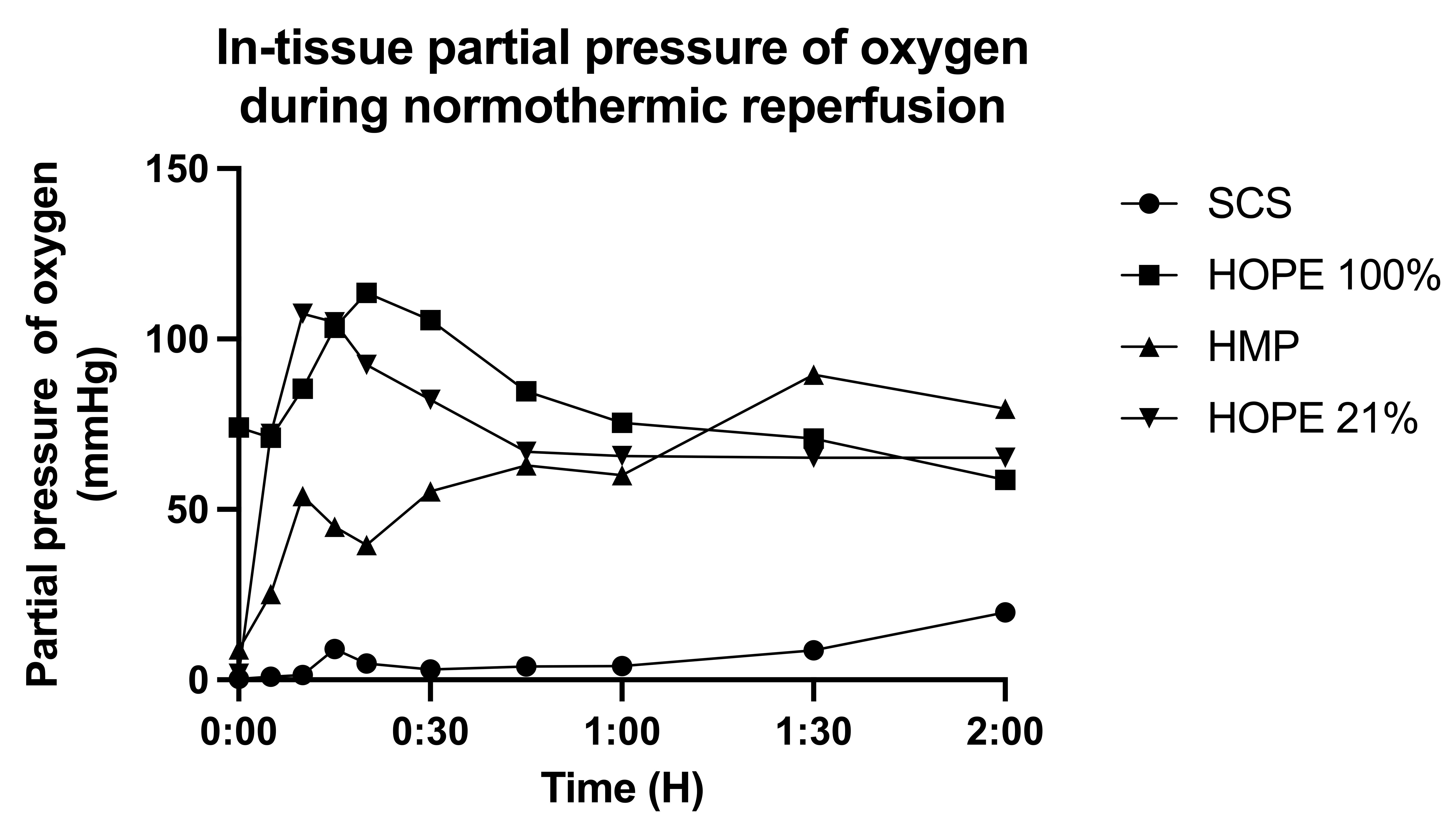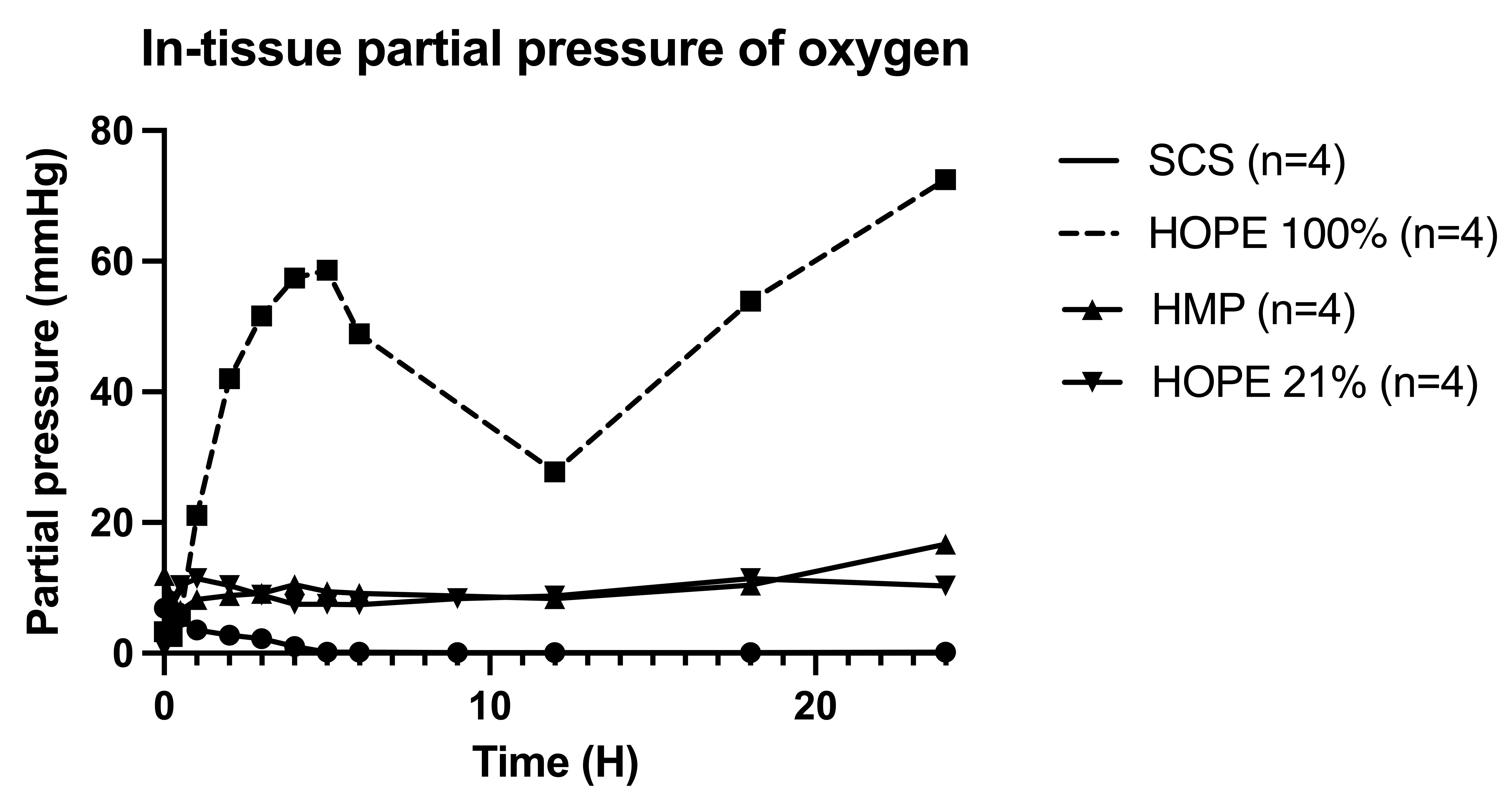 Methods: We set up a model of marginal donors with a donation after circulatory death in an animal house porcine model (warm ischemia = 30 minutes). After pancreas procurement, pancreatic transplants were preserved during 24 hours in hypothermic condition either in statical cold storage (SCS) (n=4) or on hypothermic perfusion (Waves machine, Institut Georges Lopez) without (n=4) or with oxygenation at 21% (n=4) and 100% (n=4) at 2L/min. Organ preservation solution was IGL-1 and perfusion pressure was 15mmHg. After 24 hours of hypothermic preservation, the pancreatic transplants were reperfused according to a normothermic perfusion model (centrifugal pump system, Sorin Group) with deleucocyted red blood cell. Intra-tissue oxygen partial pressure was measured by probes implanted in the parenchyma (Oxylite Pro, Oxford Optronix).