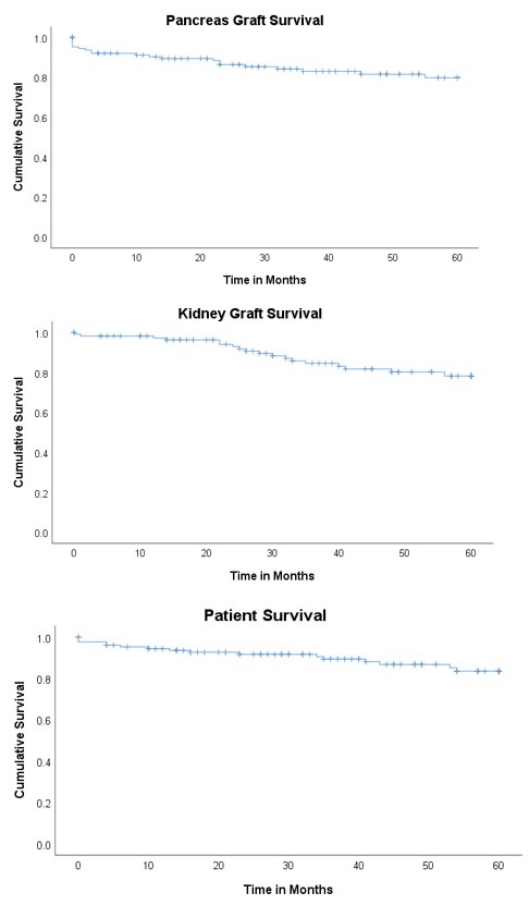 Results: Table 1 summarizes baseline demographics and Table 2 highlights complications and outcomes. Perioperative complications included 8 post-operative bleeds and 7 vascular thromboses. Patients with vascular thrombosis had subsequent transplant pancreatectomies within 6 weeks. During the study period, 51 transplant patients underwent upper GI endoscopy. Duodenum/pancreas allograft rejection was found in 26 patients. The death-censored 5-year graft survival for pancreas and kidney were 83.5 % and 84.6 %, respectively. Patient survival was 87.4%. Figure 1 shows the Kaplan-Meier curves for pancreas graft, kidney graft, and patient survival.