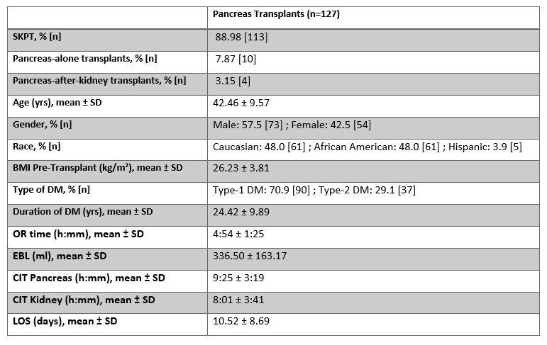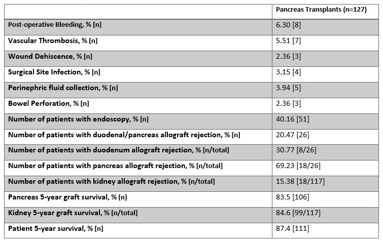 Method: This was a retrospective review study of 127 PT patients with the P-G technique from Sep 2007 to Dec 2021 at our center. 113 simultaneous kidney-pancreas transplants (SKPT), 10 pancreas-alone transplants, and 4 pancreas-after-kidney transplants were performed. Baseline demographics, OR time, estimated blood loss (EBL), cold ischemic time (CIT) for kidney and pancreas allografts, length of hospital stay (LOS), complications, number of patients with endoscopy, number of patients with allograft rejection, death-censored 5-year kidney and pancreas graft survival, and 5-year patient survival were calculated.