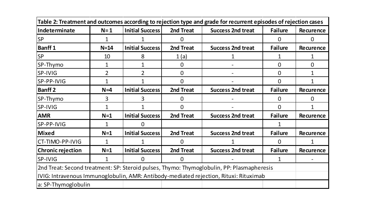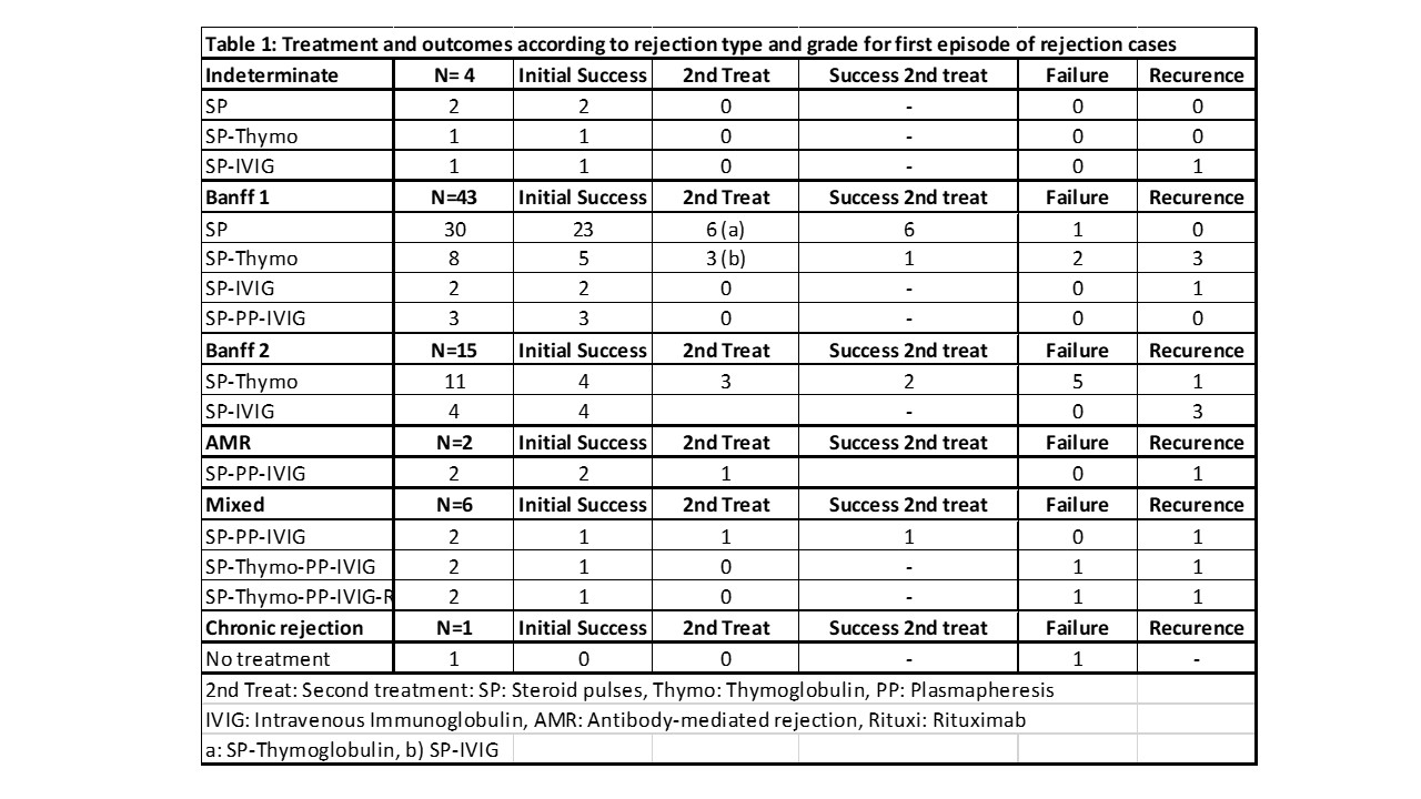 Materials and Methods: Since December 2011 pancreas biopsies are performed systematically at any graft dysfunction and pancreas rejection is treated according to rejection type and grade. The objective is to report incidence, type, grade, treatment and outcomes of pancreas rejection until March, 2022. Standard anti-rejection treatment: Indeterminate and Banff 1: Steroid pulses, Banff 2: SP+ Thymoblobulin. AMR: Steroid pulses, plasmapheresis and IVIG, Mixed rejection: SP+Thymo+PP+IVIG. However, due to kidney discordant grade or rejection and/or patient condition, treatment may have varied.