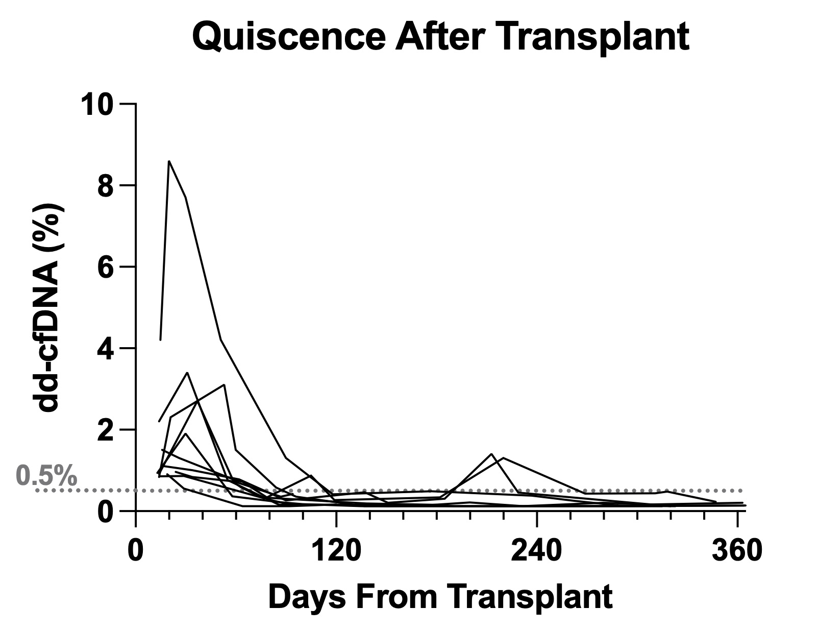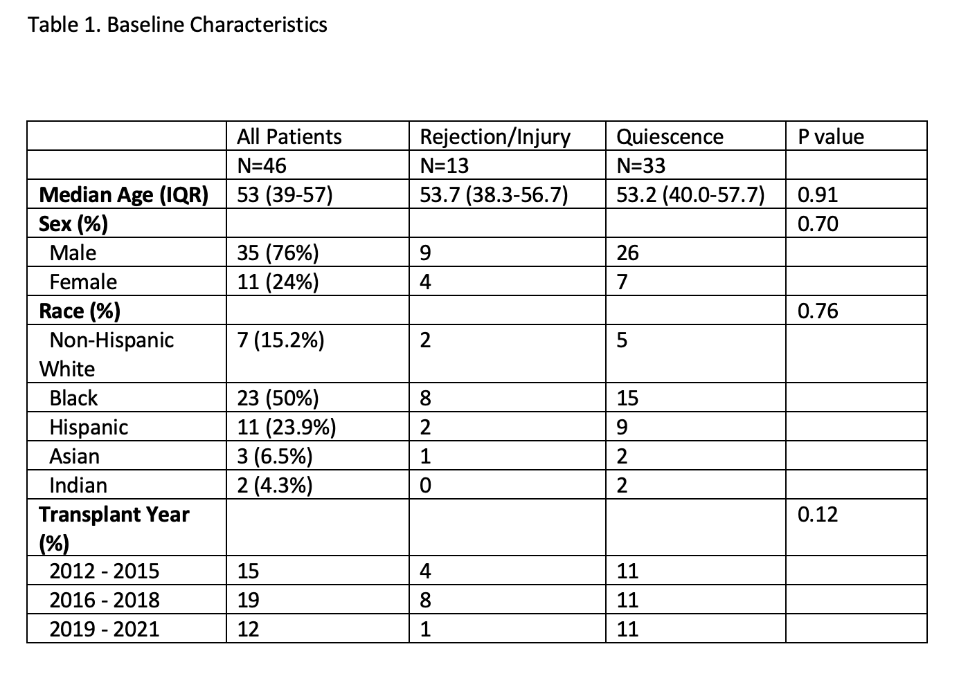 Results: 56 patients were included in the analysis (median age 53, 24% female, median follow-up 2 years). Patient demographics can be seen in Figure 1. 423 total dd-cfDNA values were collected during the study period, with median 8 values per patient. Among all patients, median baseline dd-cfDNA value was 0.18% (IQR 0.15% - 0.22%). Figure 2 shows the trends in dd-cfDNA over time for all patients who were transplanted during the study period. 19 biopsies were performed in total, 5 of which confirmed rejection. There were an additional 5 cases where biopsy could not be performed, but rejection was diagnosed clinically based on clinical factors (sustained dd-cfDNA elevations, rising lipase/creatinine, de-novo or rising donor specific antibodies). These 5 patients were treated for rejection with favorable results, including decreases in dd-cfDNA back to baseline. Among patients who did not have rejection, 97% had dd-cfDNA less than 0.5%. Dd-cfDNA may also help differentiate rejection from other graft injury, with median values in rejection 2.25%, injury 0.36%, quiescence 0.18% (p=0.0006). A pertinent example is a patient with an increase in serum lipase to greater than 20 times the normal value. However, her dd-cfDNA was not elevated (0.35%). Percutaneous pancreas graft biopsy revealed acute pancreatitis without evidence of rejection.