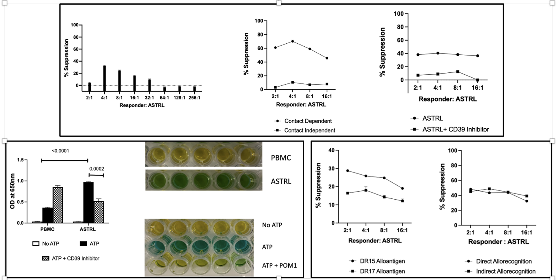 Conclusion: ASTRLs expanded from stable KTRs suppress donor antigen specific effector responses predominantly via the adenosinergic pathway and demonstrate bystander/linked immunosuppression. ASTRL-EVs enhance the suppressive capacity of ASTRLs and exhibit an increase in CD39 function. These findings indicate that human ASTRLs may be useful as autologous regulatory cell therapy in transplant recipients and that ASTRL related EVs may be useful adjuncts to ASTRL cell therapy.