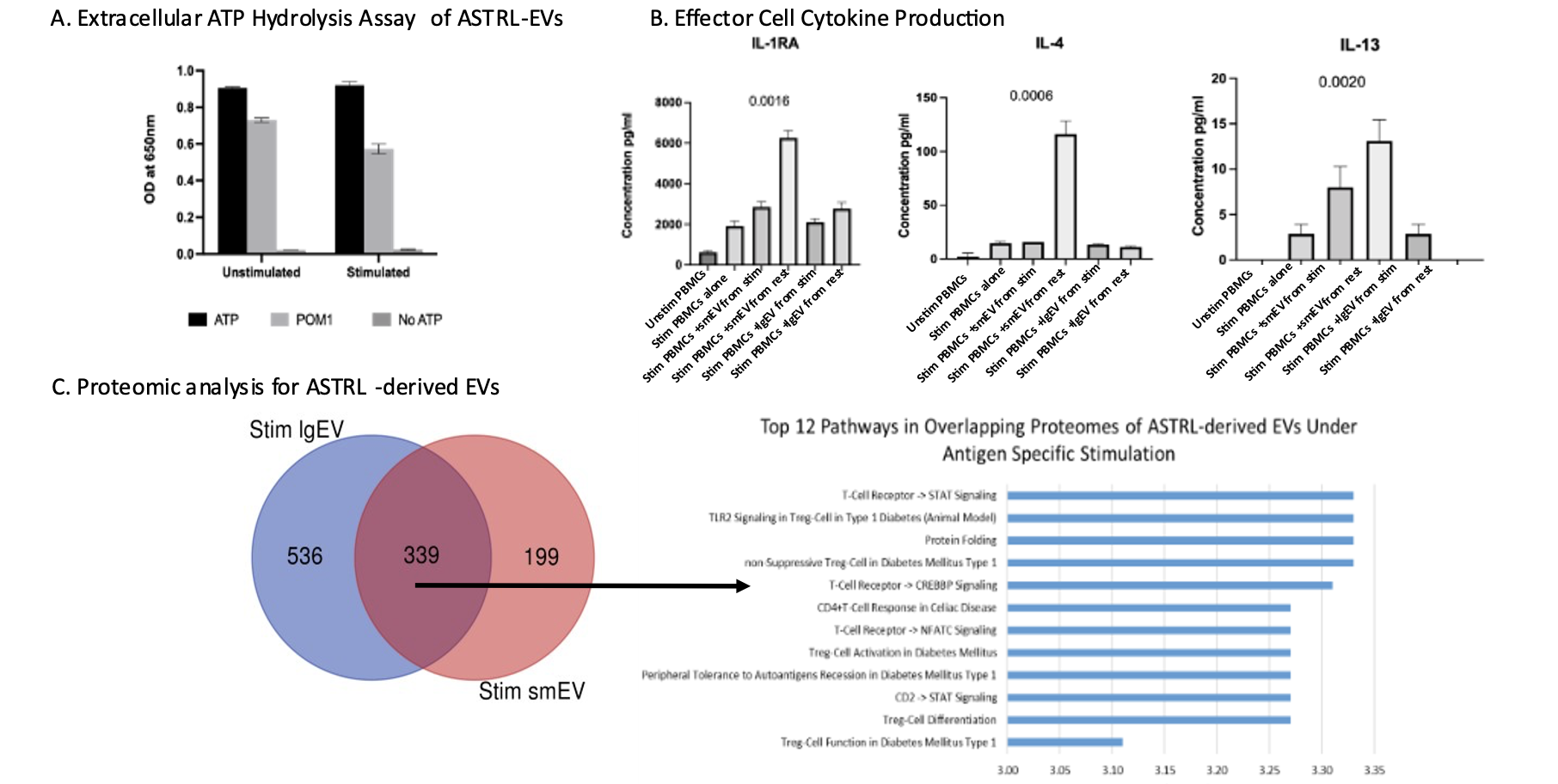 EVs isolated from ASTRLs enhanced the suppressive ability of ASTRLs and hydrolyze eATP independently, which was inhibited by POM1 (Fig. 2) and increase production of IL-4, IL-13, and IL-1RA by alloantigen stimulated T cells, indicating a biasing towards a regulatory response (Fig. 2). Global proteomics identified 1,709 unique proteins in the large EV fraction and 1,356 unique proteins in the small EV fraction. Pathway analysis revealed that both EV fractions under stimulation were enriched for proteins involved in T cell receptor (TCR) signaling and Treg differentiation (Fig. 2) with 145 differentially enriched proteins (DEPs) in the large and 162 DEPs in the small EVs (q<0.05). Pathway analysis of DEPs will be presented.