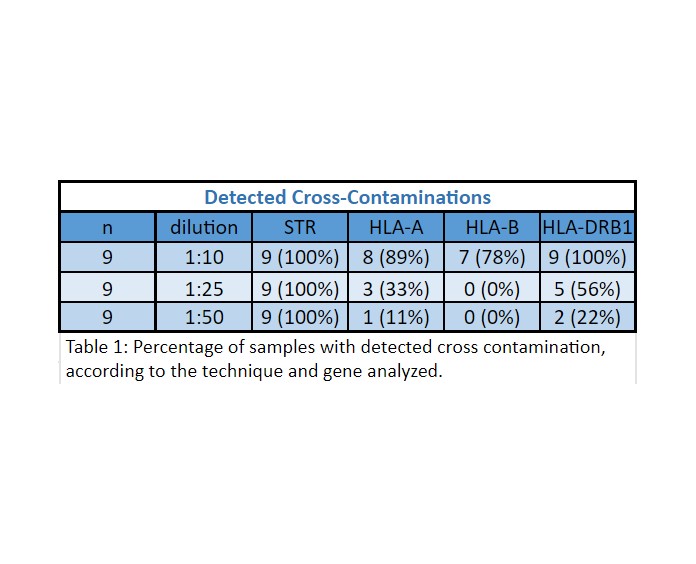Results: Unique DNA profiles were obtained for each sample with both methods. For the DNA mixtures, we were able to detect contamination in all the conditions (100%) analyzed by STR profiling. However, HLA typing showed different results depending on the gene analyzed (Table 1).