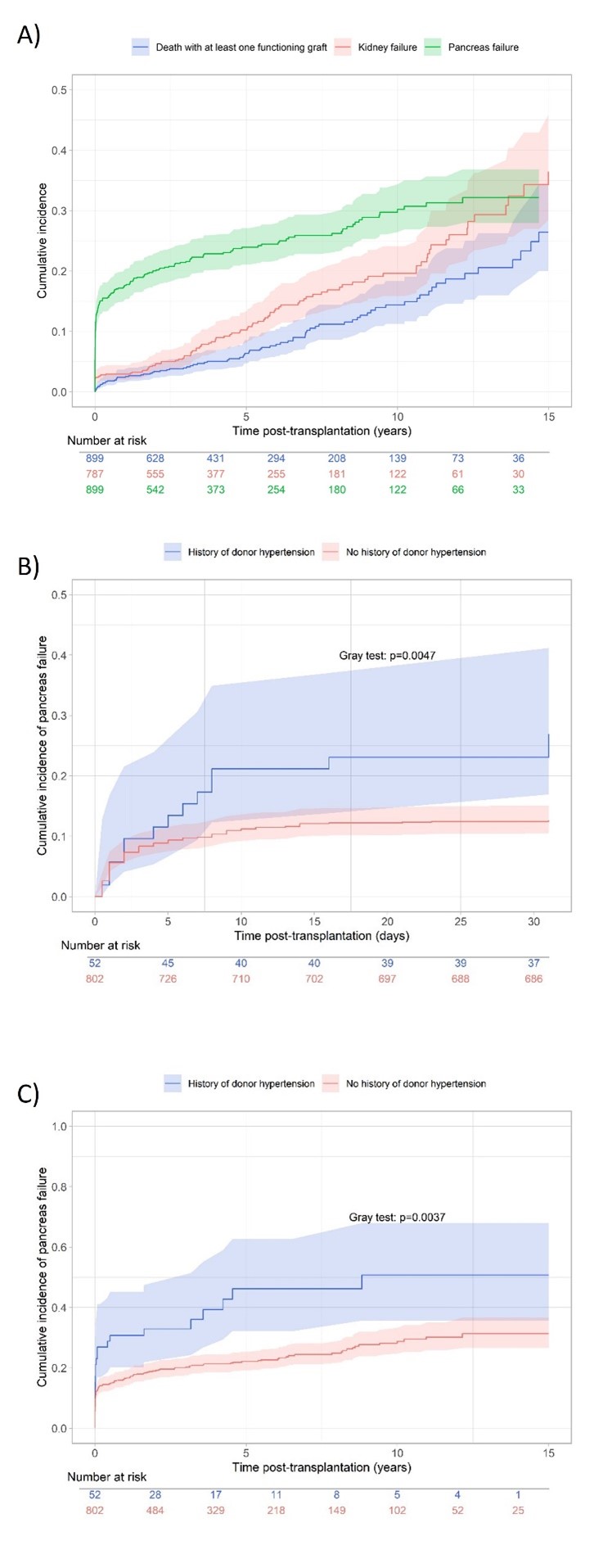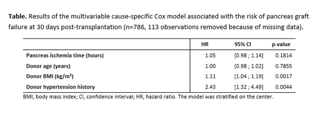 Conclusion: Despite rare, pancreas transplantation from hypertensive donors is associated with an increased risk of early pancreatic allograft failure, without significant effect on kidney allograft function, suggesting different pathophysiological mechanisms that the ones commonly described as atherosclerosis.