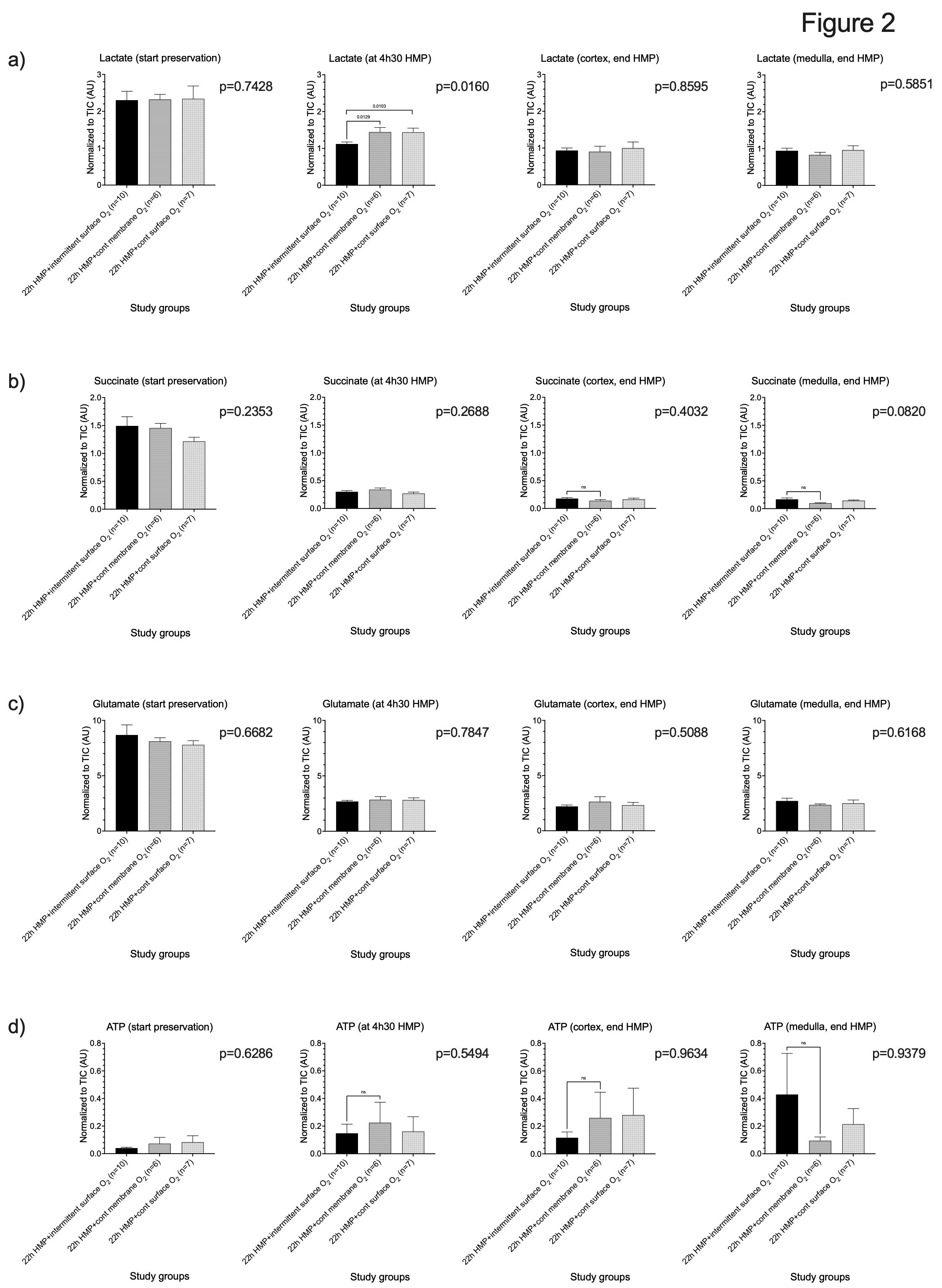 Introduction: Brief bubble, and subsequent surface oxygenation is an alternative oxygenation technique for membrane-oxygenated kidneys during HMP. The aim of this study was to evaluate the metabolic effect of interruption of surface oxygenation (mimicking organ transport) during HMP as compared to continuous surface and membrane oxygenation in a pig kidney ex vivo preservation model.