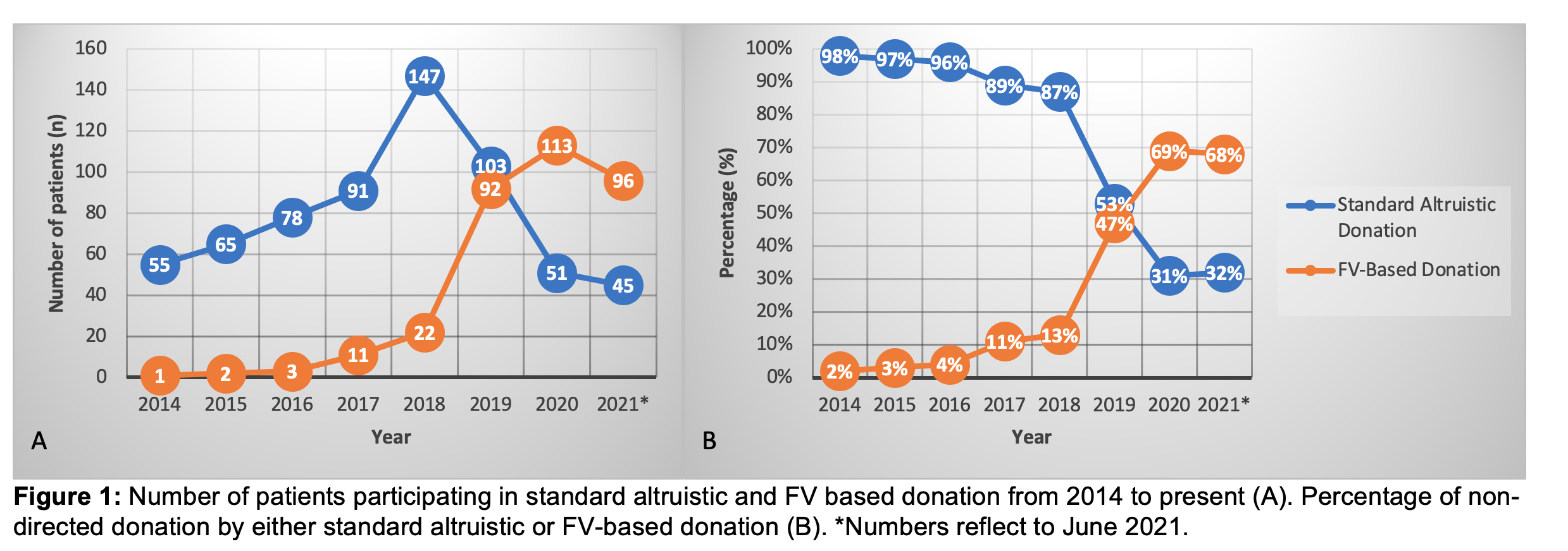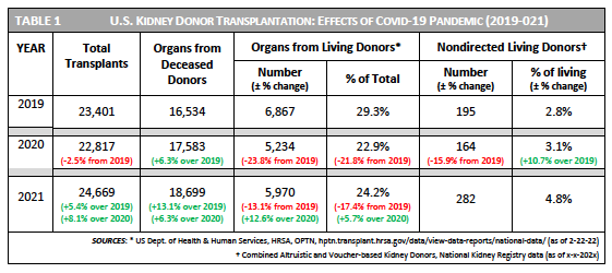 The expectation that FVs will attract new donors as well as provide assurance to people who develop doubts about their plan to make an altruistic donation is supported by current data. For example, voucher-based donation, which accounted for a tiny fraction of nondirected donation in the U.S. when it began in 2014 had surpassed altruistic donation by 2019, and its rapid growth helped nondirected donation to triple by 2021 (Figure 1). The Covid-19 pandemic interrupted this steady rise, but the decrease in nondirected donation was much smaller than for living kidney donation generally (Table 1). While altruistic donation went down, the rise in FV-based donations meant that in 2021 the percentage of living donors who were nondirected was the highest ever. Family Voucher programs, which are aligned with a central goal of transplant professionals—shortening the wait for transplants—need to broaden their outreach in minority communities and to carefully self-monitor their ability always to fulfill their moral commitment to provide all voucher-holders with a kidney from a suitable living donor.