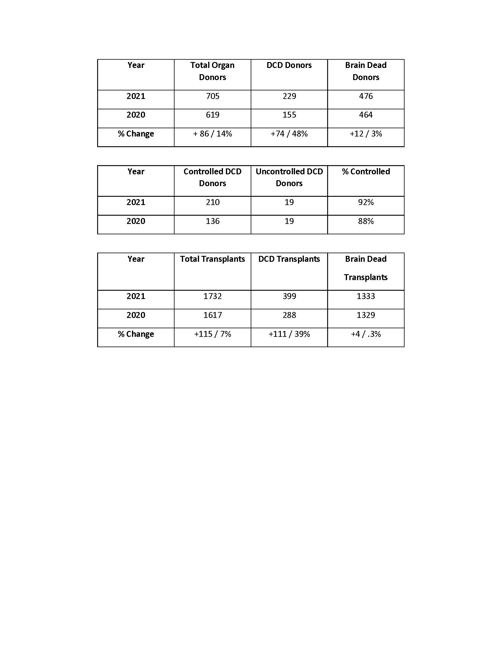 This OPO achieved a 48% increase in DCD donation and a 39% increase in DCD transplants. As a result of Hospital Development messaging for clinical referral triggers and aggressive clinical practice, the pool of potential DCD donors increased by 43%. Additionally, the focused education on preserving the donation opportunity resulted in an increase in the percentage of DCD cases that were facilitated in a controlled fashion. The OPO surpassed its goal of coordinating 30 DCD liver transplants. Authorization rates for DCD improved from 47% in 2020 to 51% in 2021. Twelve Improvement Team meetings and two physician-led DCD webinars occurred. Normothermic regional perfusion model protocol was adopted. A DCD physician survey was completed. Feedback is being incorporated into a DCD Resource Guide developed by the critical care physician work group.