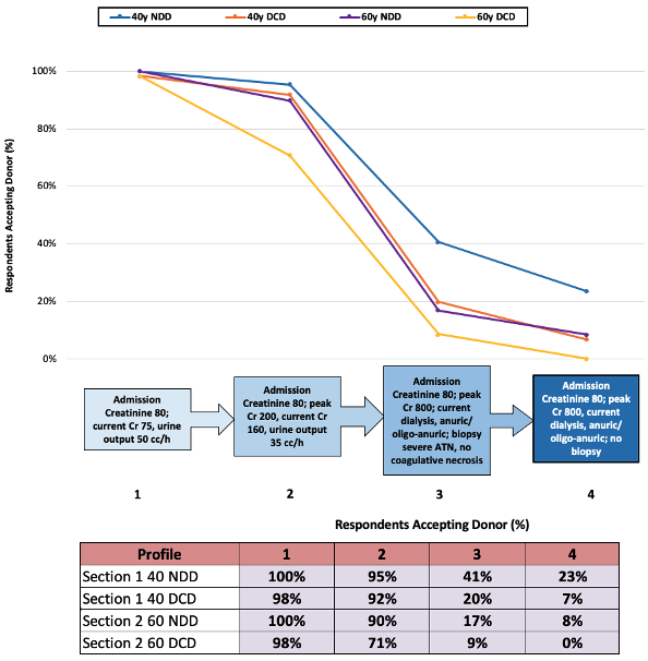 Methods: We performed an online survey (July 22-Oct 4, 2021) to assess deceased donor acceptance practices of Canadian transplant nephrologists, surgeons and urologists. Surveys were distributed by email to members of the Canadian Transplant Society. Surveys consisted of 3 sections of increasing donor complexity and respondents were asked whether they would accept or decline a hypothetical donor presented in the question stem, assuming there was a suitable recipient. The proportion of respondents completing the survey was determined, as were overall and donor scenario-specific acceptance rates amongst those providing responses.