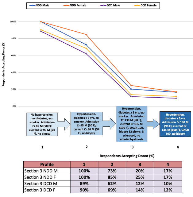 Overall acceptance rates were highest for the younger (40 years) donor scenarios and when the donor was NDD vs. DCD. The most pronounced drop in acceptance rates for all donor scenarios was between a non-dialysis dependent donor with recovering AKI (92% acceptance) and a donor with AKI requiring dialysis and a biopsy demonstrating ATN but no coagulative necrosis (20% acceptance). Acceptance rates for Section 3 are demonstrated in Figure 3. The most pronounced drop in acceptance rates for all donor scenarios was between a deceased donor with comorbidities but no CKD (85% acceptance) and a donor with CKD and a biopsy demonstrating 3 out of 12 glomeruli sclerosed, but no arterial hyalinosis (25% acceptance). Overall, advanced donor age, DCD donor status, AKI, CKD and comorbidity burden were all associated with an increased risk of deceased donor non-acceptance.