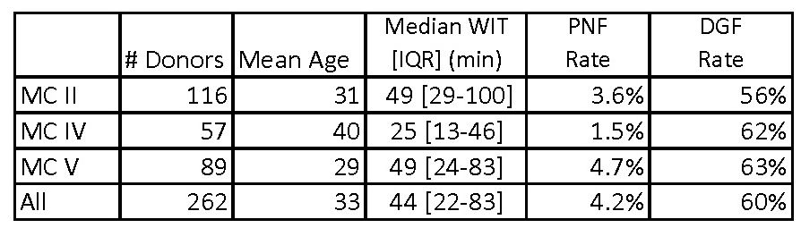 Methods: This is a retrospective single OPO, multi-center study. As a standard of practice the OPO routinely pursued uncontrolled DCD donors in the setting of hemodynamic instability and/or sudden cardiac arrest. The aggressive pursuit of these types of donors required the OPO to establish the following: an organizational expectation, training, active AOC oversight, a system to rapidly deploy resources, a communication plan with care-giving team members, and 24-hour organ preservation and surgical recovery support. Donor warm ischemic time was determined by the time from patient arrest to cross-clamp with most donors receiving CPR during that interval. Graft survival was determined by the Kaplan-Meier method. WIT, age, kidney PNF and DGF were further evaluated by donor Maastricht category.