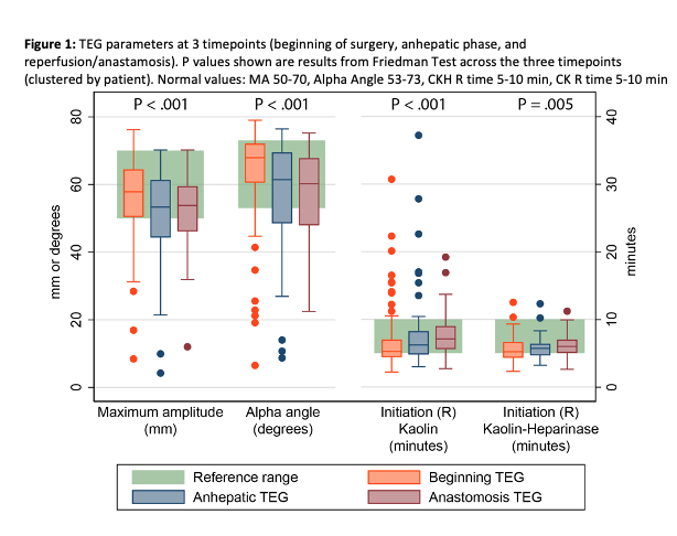 Figure 1 describe the TEG values for all 3 points during transplantation: All TEG parameters showed statistically significant change across the timepoints, although those obtained during anhepatic and reperfusion times were similar: median (IQR) maximal amplitude (MA) 57.8 (50.3-64.4) vs 53.3(44.3 -61.4) vs 53.8 (46.1-59.5), Alpha Angle (a) 67.9 (60.6-72.1) vs 61.4(48.5-69.5) vs 60.2 (47.9-67.8) and Citrate Kaolin (CK) R 5.2 (4.4-7.0) vs 6.2 (4.8-8.2) vs 7.1(5.6-9.0). MA and a decreased throughout the case while CK R time increased.