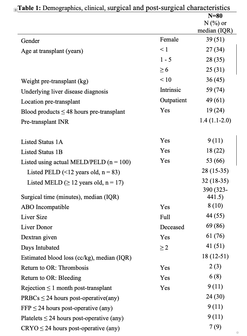 Results: Demographic, clinical, surgical and post-surgical characteristics of 80 children that underwent LT are shown in Table 1. 39 subjects were females (49%). The majority had intrinsic liver disease 59 (74%). Two episodes of portal vein thrombosis occurred. Six subjects returned to the OR for postsurgical bleeding.