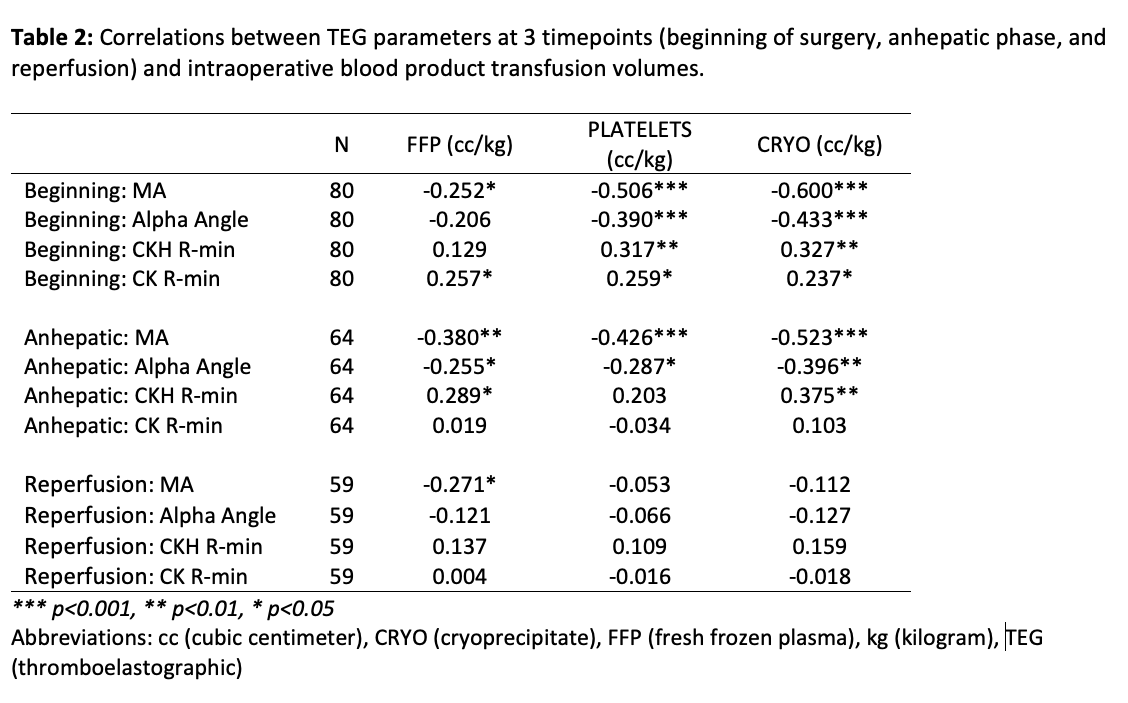 Methods: An IRB-approved retrospective review of subjects under 18 years of age undergoing LT between 2015 and 2017 was performed to describe the TEG parameters that were obtained at three time points (baseline, anhepatic and reperfusion) during LT and to evaluate blood product utilization during and immediately post-operation. Friedman Test to compare TEG parameters at the 3 timepoints, and Pearson correlation coefficients to evaluate association with blood product transfusion volumes were used.