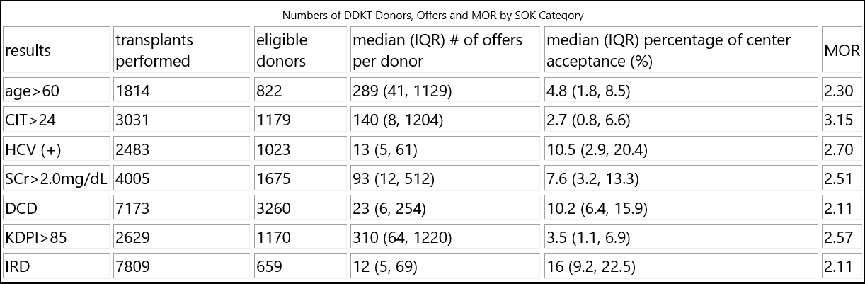 Methods: We studied 5,646,748 offers of 8,539 SOK donors from 1/1/2018-12/31/2019 using SRTR data. Pediatric centers, center annual volume<1, or multiple match-runs were excluded. We defined SOK offer as: age>60, cold ischemia time (CIT)>24 hours, hepatitis C (HCV), serum creatinine (SCr)>2.0 mg/dL, donated after cardiac death (DCD), KDPI>85, or infectious risk donors (IRD). We used multilevel logistic regression to calculate the median odds ratio (MOR), a measure of center-level variation, for each subtype of SOK.