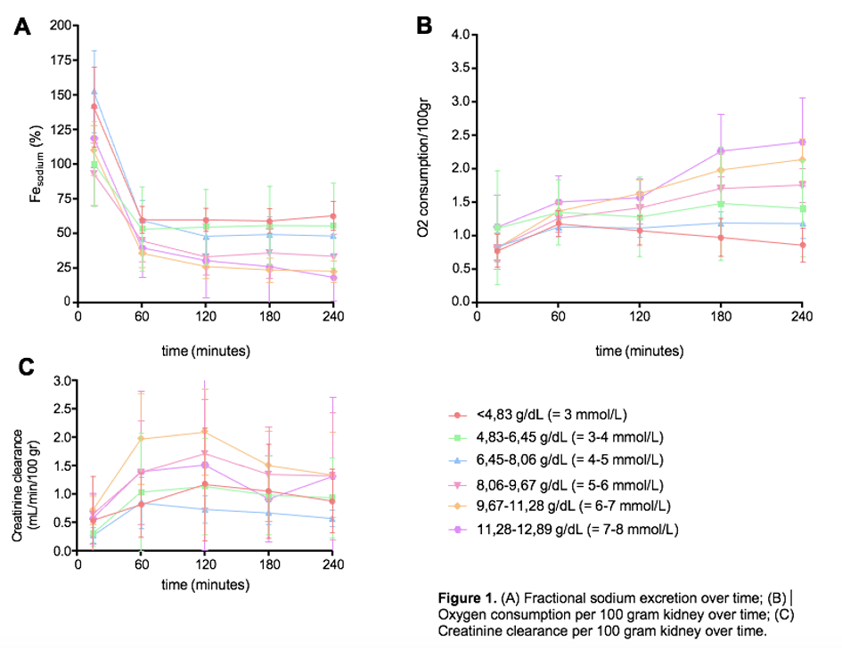 Methods: Using pooled data from our lab’s experimental work, slaughterhouse obtained porcine kidneys that underwent oxygenated NMP for four to six hours with a red blood cell-containing perfusion fluid between 2017 and 2022, were included in this study. All kidneys had a cold preservation period with either (oxygenated) hypothermic machine perfusion (HMP) or static cold storage (SCS). Kidneys were stratified according to arterial perfusate hemoglobin concentration at the start of NMP per 1 g/dL increment between 1,61 g/dL (= 1 mmol/L) and 12,89 g/dL (= 8 mmol/L). Outcome variables were fractional sodium excretion, creatinine clearance, oxygen consumption, lactate flux rates and adenosine triphosphate (ATP) levels during NMP.