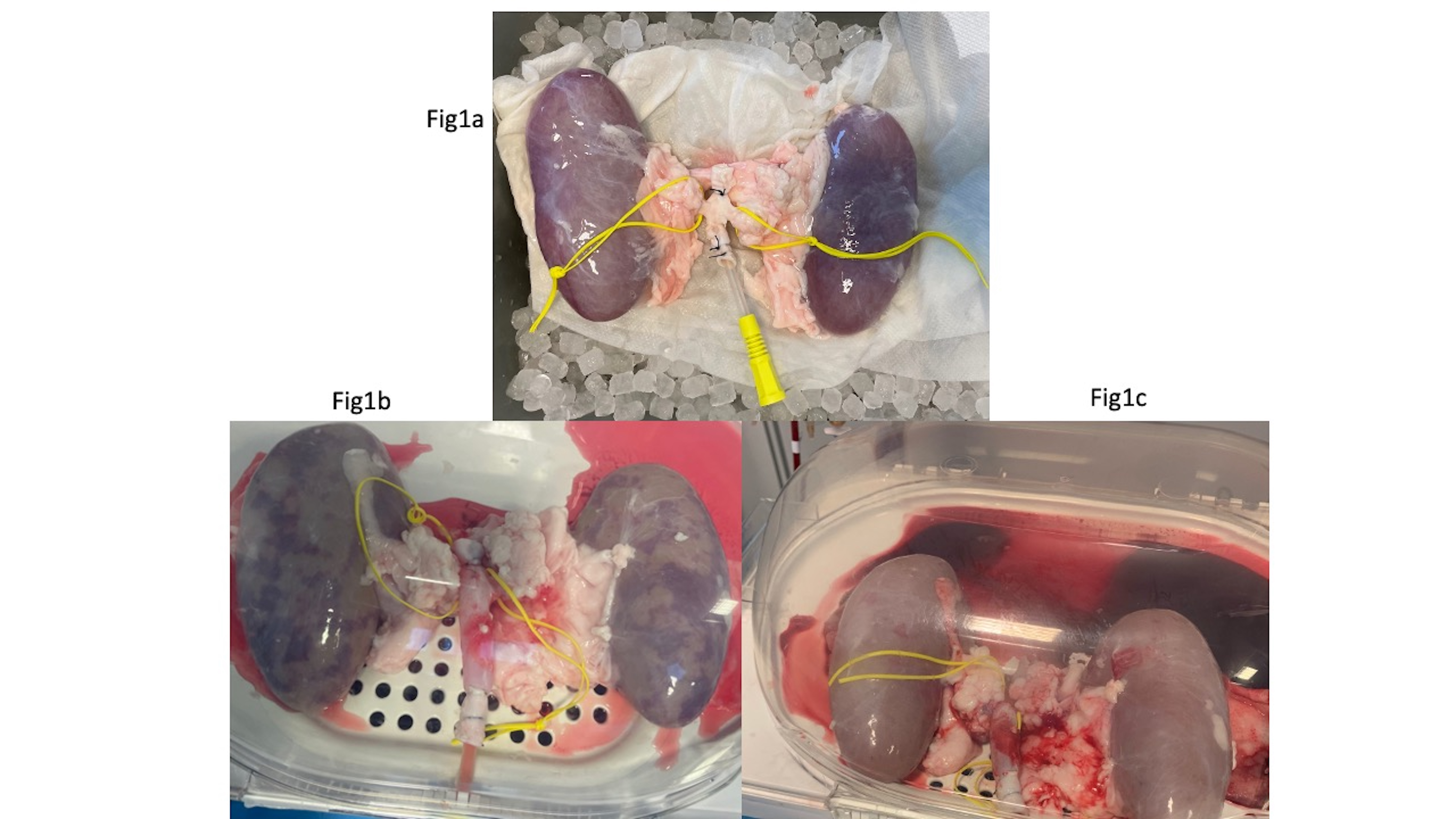 Method: After the pig was dead, the abdominal organs bloc was retrieved. Organs were separated and the bloc, composed by kidneys, aorta and inferior vena cava was prepared at the back-table and perfused with heparinized (10.000UI) perfusion solution (Celsior 1l). The back-table surgery consisted in the ligation of collateral branches from aorta and inferior vena cava, ligation of perirenal fat, proximal aortic stump ligation and distal aortic stump cannulation (Fig 1a). The perfusion was performed with PerKidney machine perfusion (PerLife, Aferetica s.r.l, Bologna, Italy). During the hypothermic oxygenated perfusion was set a target pressure (P) of 50 mmHg and a target flow (F) of 100ml/min. Normothermic perfusion, as a simulation of transplant, was performed setting a target P of 75 mmHg and a target F of 500ml/min.