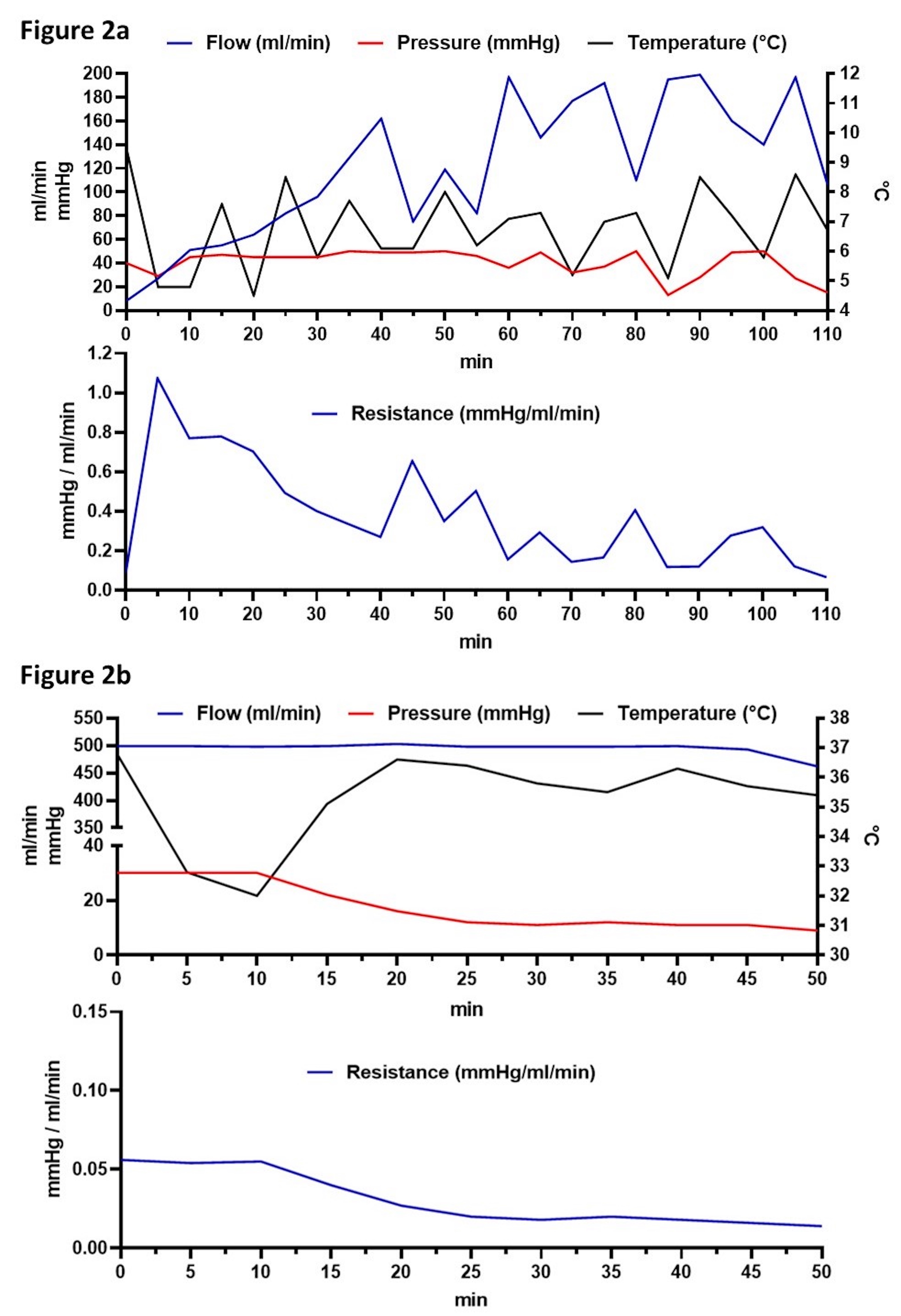 Results: The no-flow period lasted 35min, back-table surgery lasted 27.5 ±3.5 min. The hypothermic perfusion lasted 110 min: the mean temperature (T) during perfusion was 6.8 ±1.4 °C, the mean F was 120.4 ±58.7 ml/min, the mean P was 40.3 ±11.2 mmHg and the mean resistance (R) was 0.37 ±0.26 mmHg/ml/min. R started at 1.07, dropped down after 55min concluded at 0.06. Parameters during hypothermic perfusion are reported in figure2a. The normothermic perfusion lasted 49 min: the mean T was 35.3 ±1.5 °C, the mean F was 495 ±11 ml/min, the mean P was 18 ±8 mmHg and the mean R was 0.031 ±0.016 mmHg/ml/min. R started at 0.05, dropped down after 10 min and concluded at 0.01. During the perfusion kidneys gradually changed in color (Fig 1b-1c). Parameters during normothermic perfusion are reported in figure2.