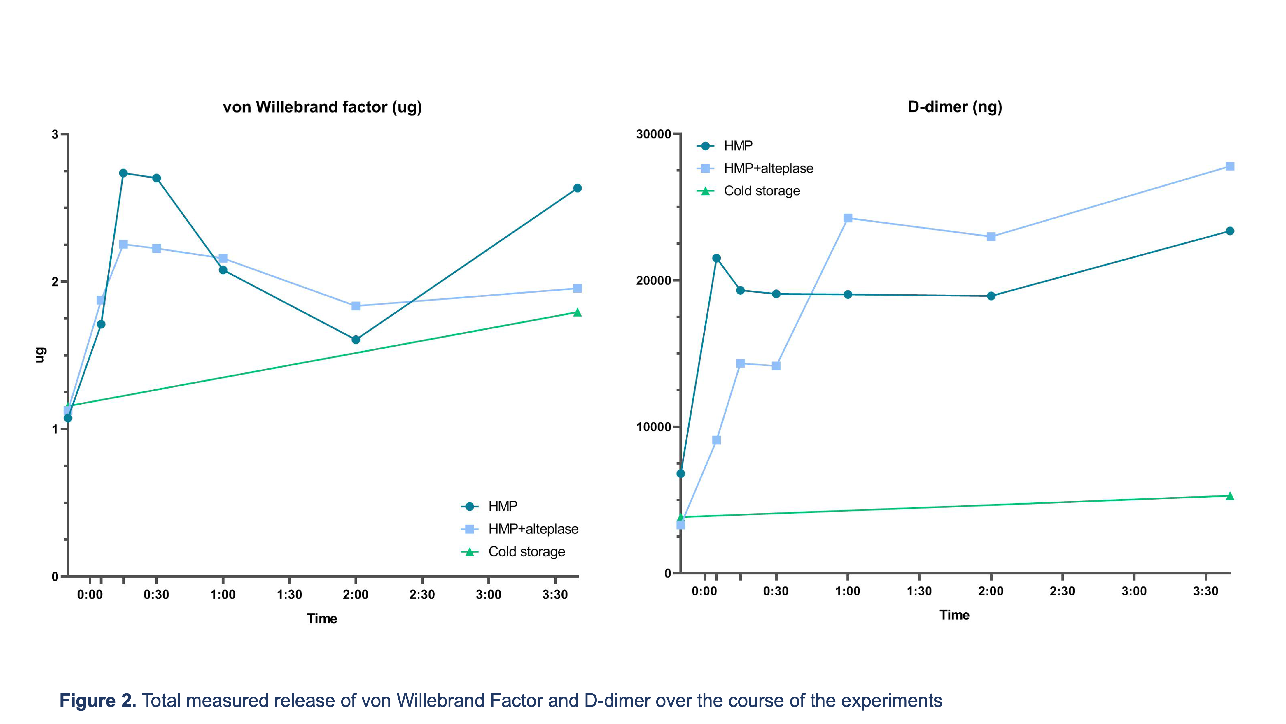 Our results suggest that the superiority of oxygenated HMP is at least partly caused by a better flush to clear the kidney graft from donor-derived thrombi, considering an increased release of D-dimer, and a reduction of microthrombi over time. This phenomenon has already been observed in machine-perfused human livers. Furthermore, HMP does not significantly increase endothelial activation, as evidenced by low levels of VWF in the perfusate. Addition of a thrombolytic agent to an HMP-fluid does not seem to be of added value.