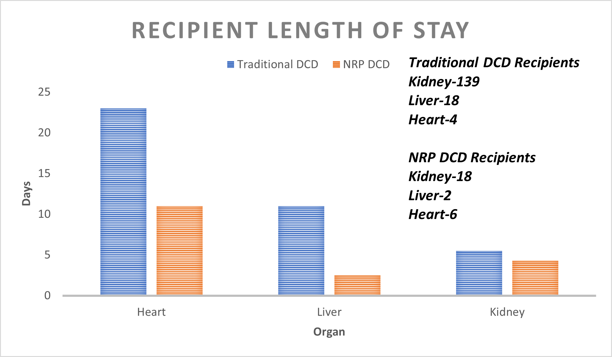 Results: Within our OPO, we define Warm Ischemic Time (WIT) as the start of the agonal phase (systolic BP < 80 mmHg or SpO2 < 80%) to NRP start. Warm ischemic time in NRP DCD patients includes both the agonal phase and time to initiation of artificial regional perfusion (averaging 7 minutes). Recipients from a DCD donor in which NRP was utilized had an average length of stay (LOS) of 6 days versus 13 days for traditional DCD. Compared to traditional DCD heart recoveries (average LOS 23 days with one patient expiring 42 days post-transplant), the NRP average length of stay was 11 days. NRP donors had a lower average age (33) to traditional DCD donors (49). Additionally, within the NRP DCD population, we saw a higher number of organs transplanted per donor (OTPD) by almost 1 organ with NRP DCD at 2.71 OTPD and traditional DCD at 1.88 OTPD. This is in spite of an increase in average WIT by 11 minutes for NRP donors.