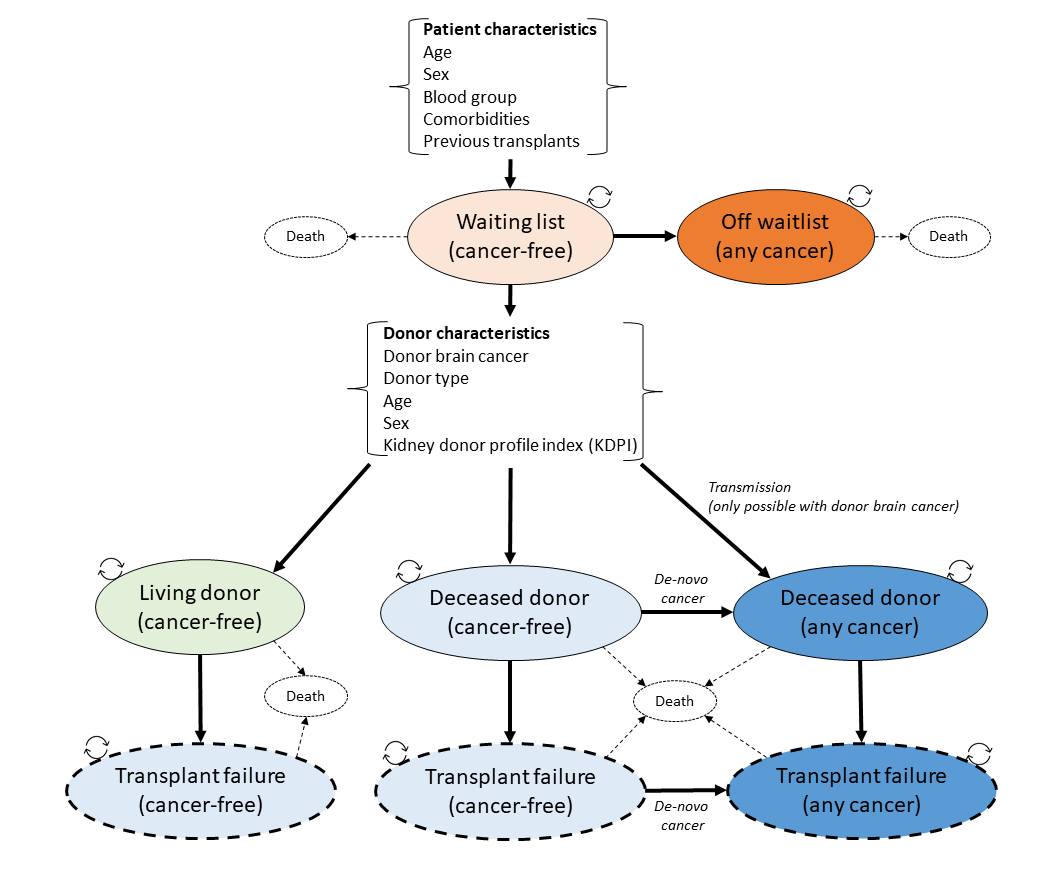 Method: We assessed the cost-effectiveness of increasing utilization of these potential donors using a Markov model patient simulation (Figure 1) to estimate costs and consequences from a payer perspective (Australian government) using linked transplant registry data. We estimated costs and quality-adjusted life-years (QALYs) from three interventions: decision support for clinicians in assessing donor risk, improved data accuracy with real-time data-linkage to hospital records and cancer registries, and increased risk-tolerance to allow intermediate-risk donors.