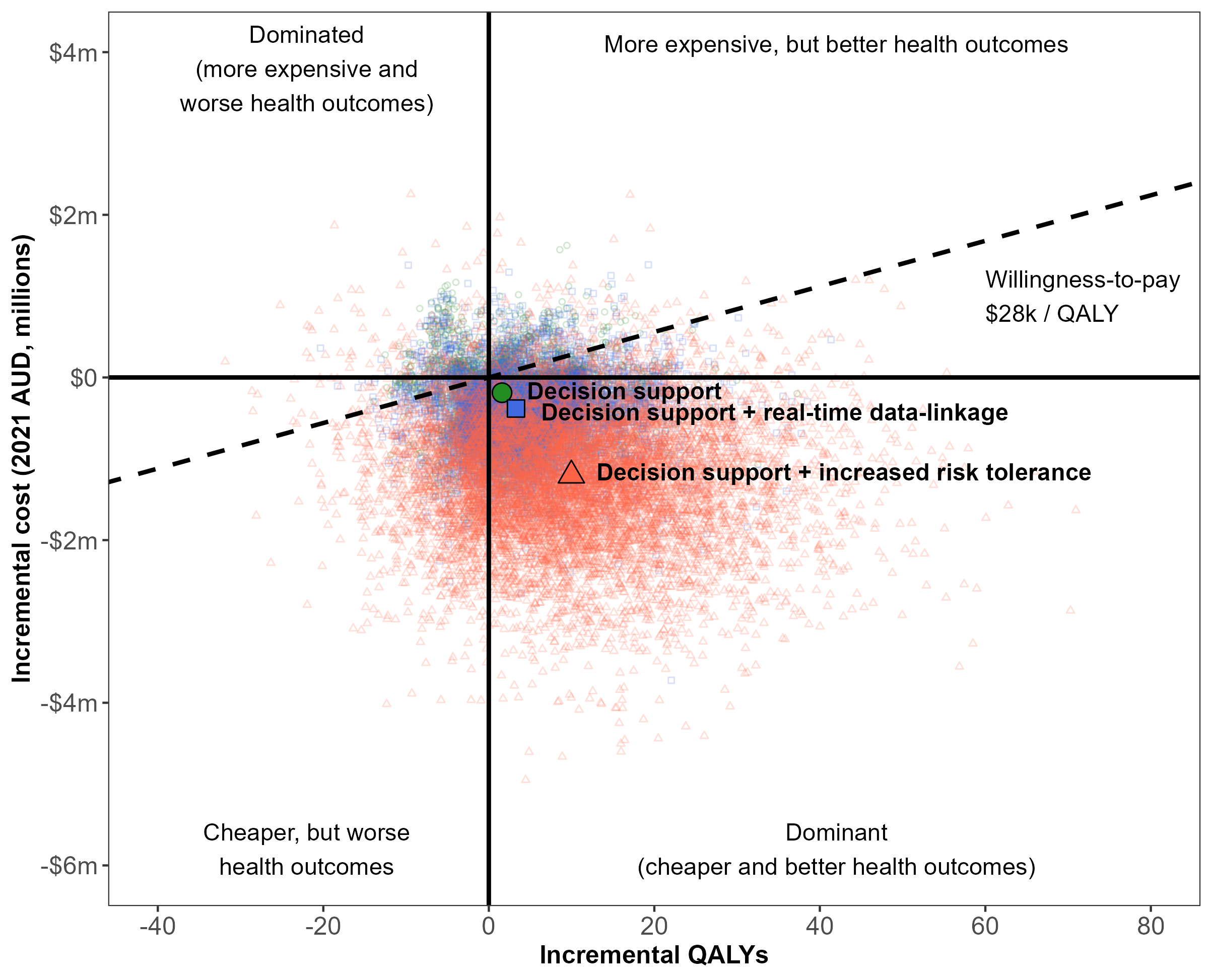 Results: Decision support increased donation 0.3% with a 2% transmission rate and was dominant (improved QALYs and cost-saving) in 56% of simulations (Figure 2). Real-time data-linkage increased donation 0.6% with 1.8% transmissions and was dominant in 57% of simulations. Increasing risk tolerance increased donation by 2.1% with 3.3% transmissions and was dominant in 75% of simulations (mean +10.0 QALYs and $1.2m ($904k USD) cost-savings).