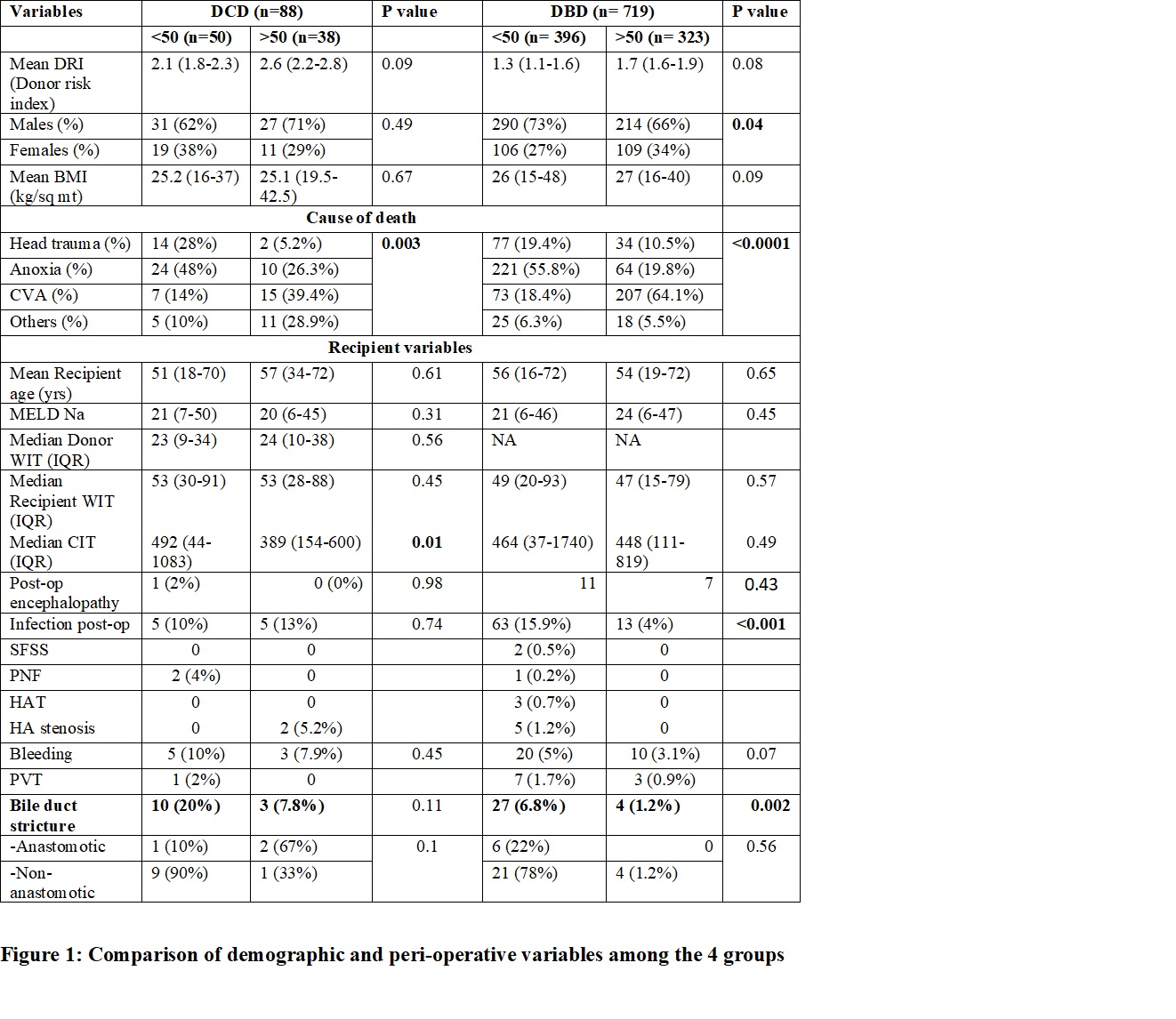 Methods: All patients having undergone DDLT between January 2016 and December 2021 were included in the study. The population was divided into 4 groups: DCD grafts (<50 years and >50 years) and DBD (Donation after brain death) grafts (<50 years and >50 years). The peri-operative and post-operative outcomes were compared. The borderline grafts having placed on Organox machine perfusion for optimisation were excluded from the study (n=38).