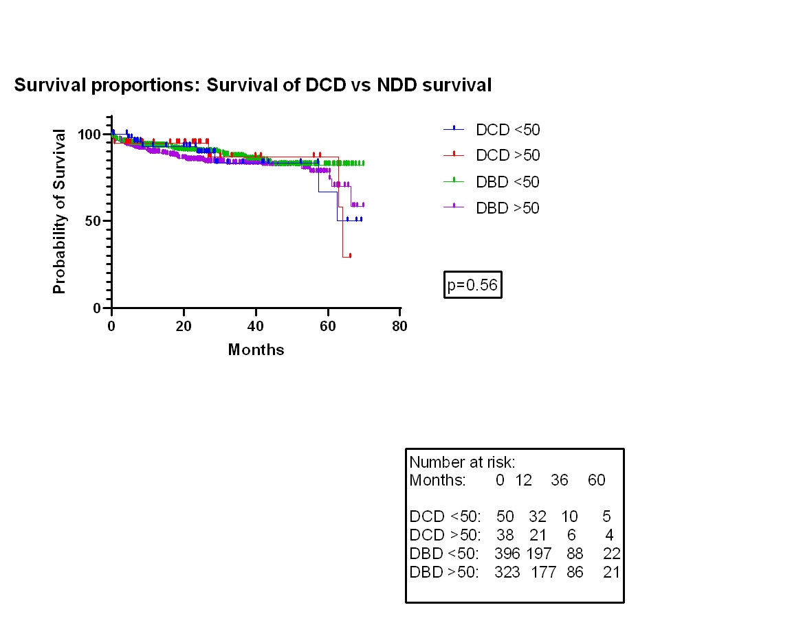Results: Of the 807 patients included in the analysis, 88 (10.9%) received a graft from the DCD donors including MAiD (Medically assistance in dying) donors, with 38 (43%) of them being from the elderly donors. In the DBD group (n=719; 89%), 323 (45%) received grafts from the elderly donors. The demographic and peri-operative parameters were comparable in both groups (Figure 1).
