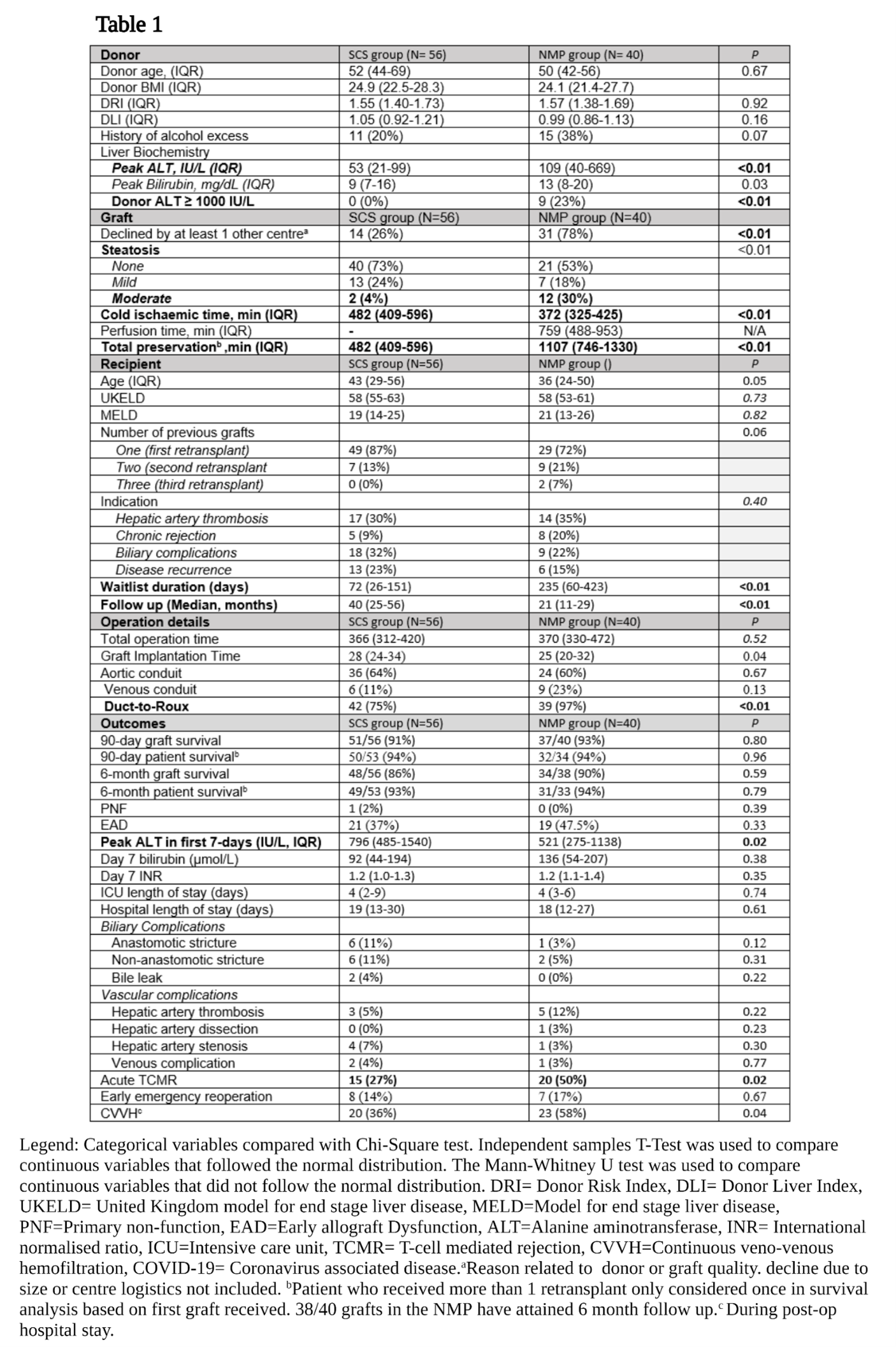Conclusion: This is the first study to demonstrate that NMP technology can be safely used for sub-optimal liver grafts, and these can be safely transplanted into patients that require retransplantation. This technology can therefore expand the graft options available to this high-risk group.
