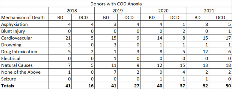 One OPO took a deep dive into their data to understand what was driving their own OPO’s growth and to examine if this suggested trend existed in their donation service area. A 4-year retrospective data review was completed, and donors were categorized by donor type (BD vs DCD), age, and cause of death. Any donor whose cause of death (n=304) was listed as anoxia was examined closely and classified by the cause of the anoxic injury. Nine primary causes for anoxic brain injury emerged in the data.