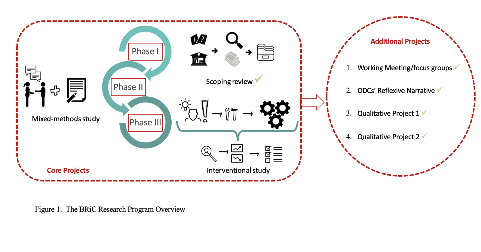 Method: The BRiC Research Program was built using a participatory approach that provides the best evidence possible to help address the specific needs of knowledge users (Organ Donation Organizations and OTDCs). The BRiC started with the development of a core three-phased study: phase 1, we published a scoping review to investigate the available literature on burnout and compassion fatigue among OTDCs; in phase 2, we are using a mixed-methods approach to explore work-related issues among Canadian OTDCs; and in phase 3, informed by phases 1 and 2, we will develop, implement and measurethe impact of interventions designed to address work-related issues among OTDCs. In addition to the core three-phased study, we also completedfour related projects: (1) a working meeting with representatives from Canadian Organ Donation Organizations; (2) a reflective narrative paper co-authored by Canadian OTDCs discussing their views and experiences with work-related issues; (3) a qualitative study that investigated experiences of OTDCs about compassion fatigue, burnout and resilience; and (4) a qualitative study that explored the perceptions of OTDCs related to their experiences in a Relationship Centred Care workshop.
