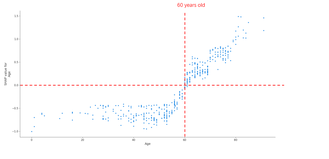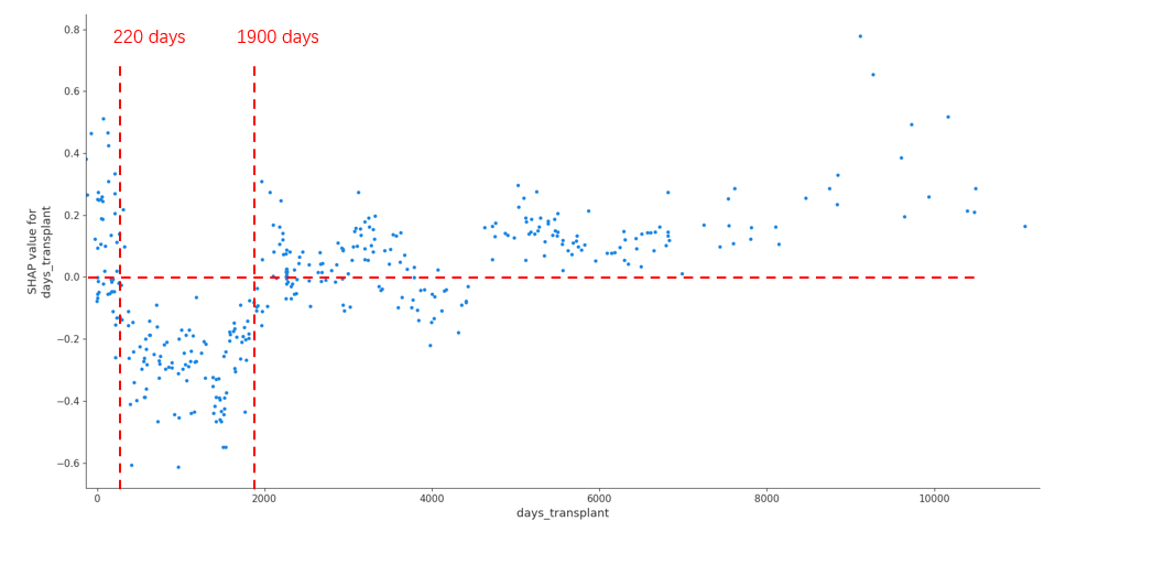 Result: Overall XGBoost achieved the best prediction performance for patient survival among all the algorithms, achieving an AUC of 0.842 (The Area Under the Curve). In the analysis of SHAP values for individual significant factors, three major categories emerged as significant for patient survival – infection period, recipient age, and transplant vintage. In comparing the survival of different patient subgroups, XGBoost performance was better for infections occurring during the first wave (until June 2020; AUC 0.842) than in subsequent waves (AUC 0.755). Conversely, XGBoost performance was better for younger patients (<60 years old; AUC 0.869) than for older patients (AUC 0.773) (Figure1). Finally, the SHAP analysis identified a U shape curve for patient survival according to time from transplantation, with recipients with an interval of less than 220 days or more than 5,2 years presenting an increased risk of death from COVID-19 disease (Figure 2).