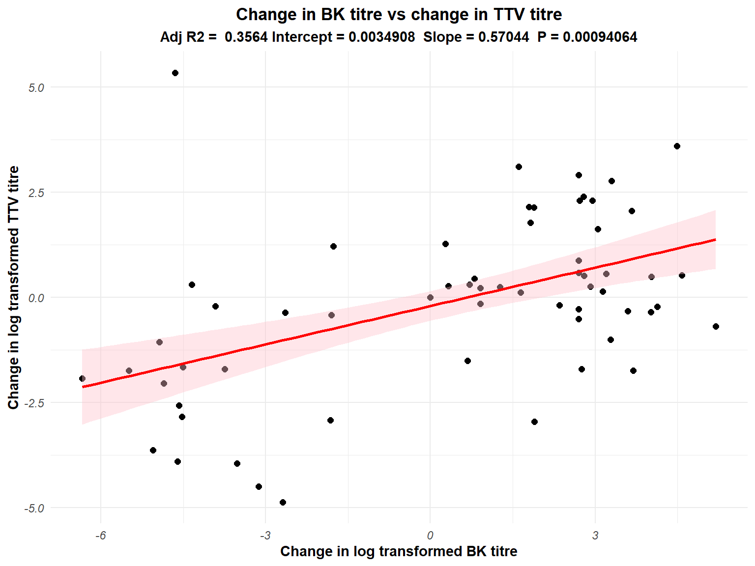 Conclusion: Our study demonstrates that TTV titres more accurately indicate the effect of IS/CNI changes on BK titre and demonstrates its potential as a sensitive assay to objectively guide IS modification compared to current empirical practice in the management of BKVaN. A randomised control trial is warranted comparing empirical practices to TTV titre guided adjustment of immunosuppressive medications.