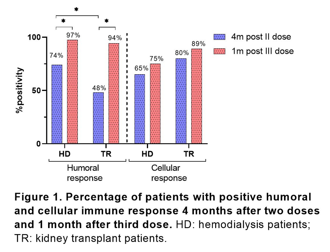 Materials and Methods: Multicenter, prospective study in 100 adult patients on hemodialysis (HD) and kidney transplant (KT) recipients were evaluated. Blood samples were taken at the first visit (120 days after the second vaccination - BNT162b2 or SinoVac) and at the second visit (30 days after the 3rd vaccination - BNT162b2). ELISA against IgG Spike SARS-CoV-2 was performed to evaluate humoral response in a total of 47 HD and 53 KT patients. To evaluate cellular response, peripheral mononuclear cells from patients were stimulated with SARS-CoV-2 pool peptides, and IFN-g-secreting cells and SARS-CoV-2-specific T cell response was performed using ELISPOT and flow cytometry, respectively. Cellular immune response was performed in 31 HD and 32 KT patients. Positive cellular immune response was defined as more than 20 spots forming counts (SFC)/million cells and/or percentage of IFN-g+ CD4+ or CD8+ T cells.