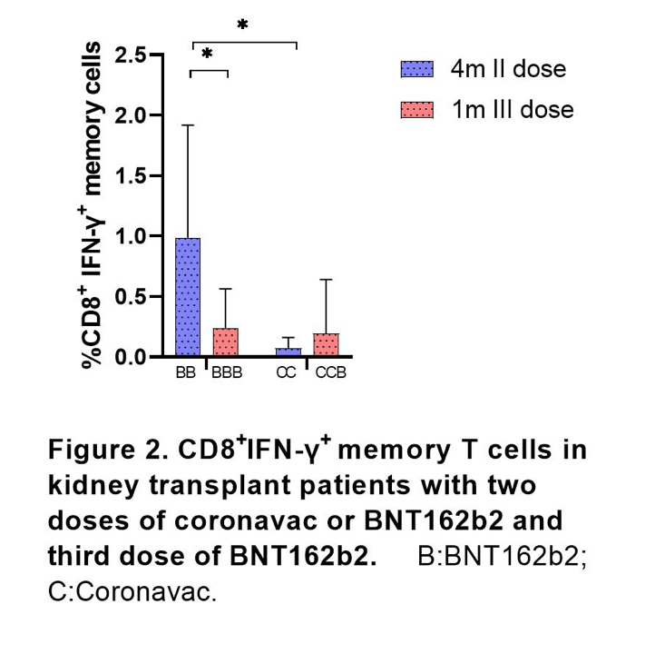 Conclusion: Although the humoral response with two doses of the SARS-Cov2 vaccine was poor in transplant patients, especially in those who received the Coronavac vaccine, 83% of patients had cellular immune response. Better cellular and humoral responses with BNT162b2 vaccine were found. There was a significant increase of humoral immune response with the 3rd dose. Altogether, three doses scheme including BNT162b2 are recommended for kidney transplant and hemodialysis patients.
