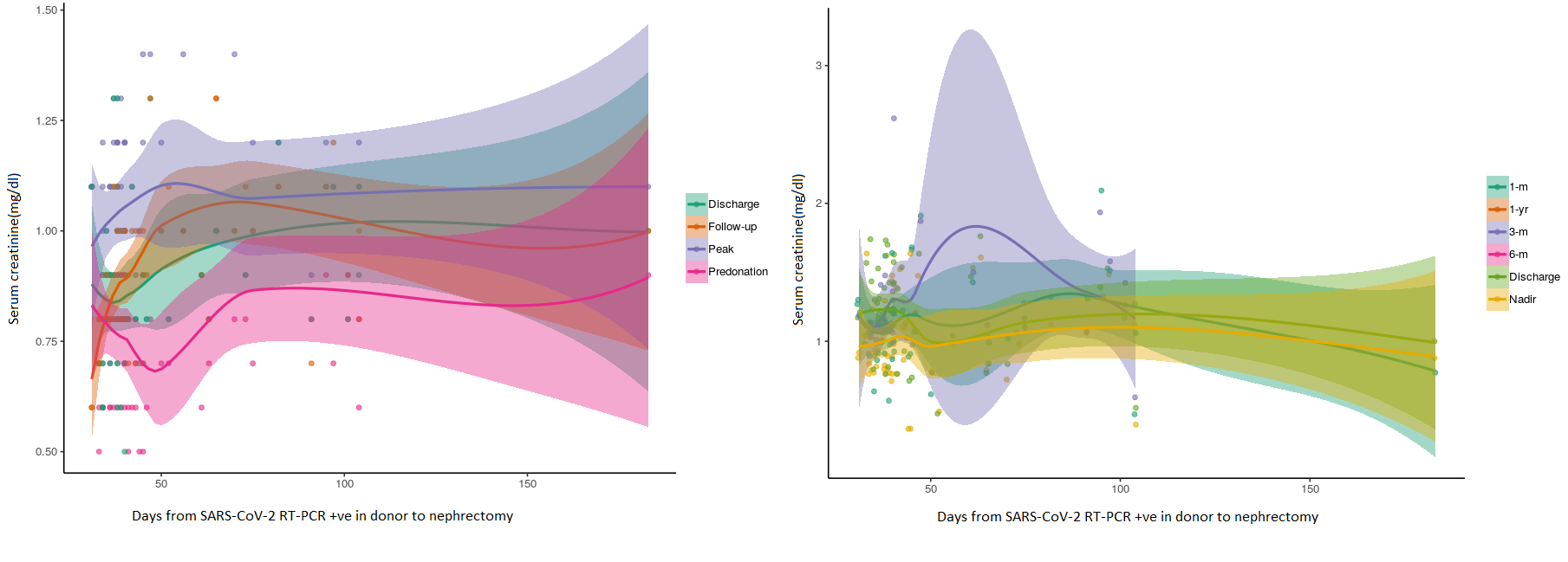Results: Clinical severity in patients and donors was asymptomatic/ mild without requiring oxygen therapy in 77%(n=49), 95.4%(n=63) and moderate/ severe 4.6%(n=1) illness requiring oxygen therapy in 23%(n=15) and 4.6%(n=1), respectively. The mean ± SE(SD) waiting time from first documented RT-PCR negative to surgery for recipient and donor was 90.9 ± 9.27(74.1) and 47±4.5 (29.2) days respectively. Six (9.3%) episodes of biopsy-proven acute rejection (BPAR) were reported at follow-up of 214 ± 14.8(119) days and median (IQR) of 227(109-309) days. The locally weighted scatter plot smoothing curve for creatinine during follow-up in the D-R pair showed no trends of raised creatinine in the context of waiting time from COVID-19 to surgery. No graft loss, death, reactivation/reinfection, and any complications relating to surgery or COVID-19 were reported in the study.