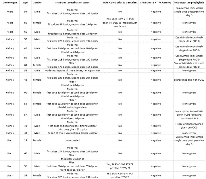 Methods: We evaluated the use of organs from SARS-CoV-2 donors between 6/17/2021 to 2/24/2022. 18 patients were transplanted with SARS-CoV-2-positive donor (COVID+) organs: 3 heart, 4 liver, and 11 kidney recipients. SOT recipients were tested for presence of SARS-CoV-2 by RT-PCR prior to and after their operations. Induction immunosuppression was standard and not altered from protocol. Postoperatively, recipients were kept in modified droplet precautions and received post-exposure treatment recommended by Transplant Infectious Disease. Treatment regimens included remdesivir and monoclonal antibodies directed against SARS-CoV-2 (Figure 1). Perioperative and post discharge care was administered by a multidisciplinary care team with no significant alterations in care protocols.