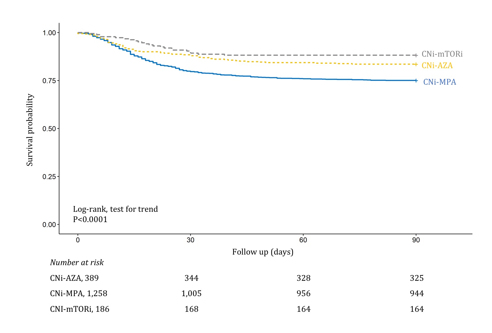 Methods: This study included data from 1,833 KTRs with COVID-19 diagnosed between Mar/20 and Apr/21 extracted from the national registry prior to immunization. All patients were taking calcineurin inhibitor (CNi) associated with mycophenolate (MPA, n=1,258), azathioprine (AZA, n=389) or mTOR inhibitors (mTORi, n=186). Outcomes within 30 and 90 days were assessed. Patient survival was estimated by Kaplan-Meier and the multivariable analysis was provided by center-adjusted Cox regression models.