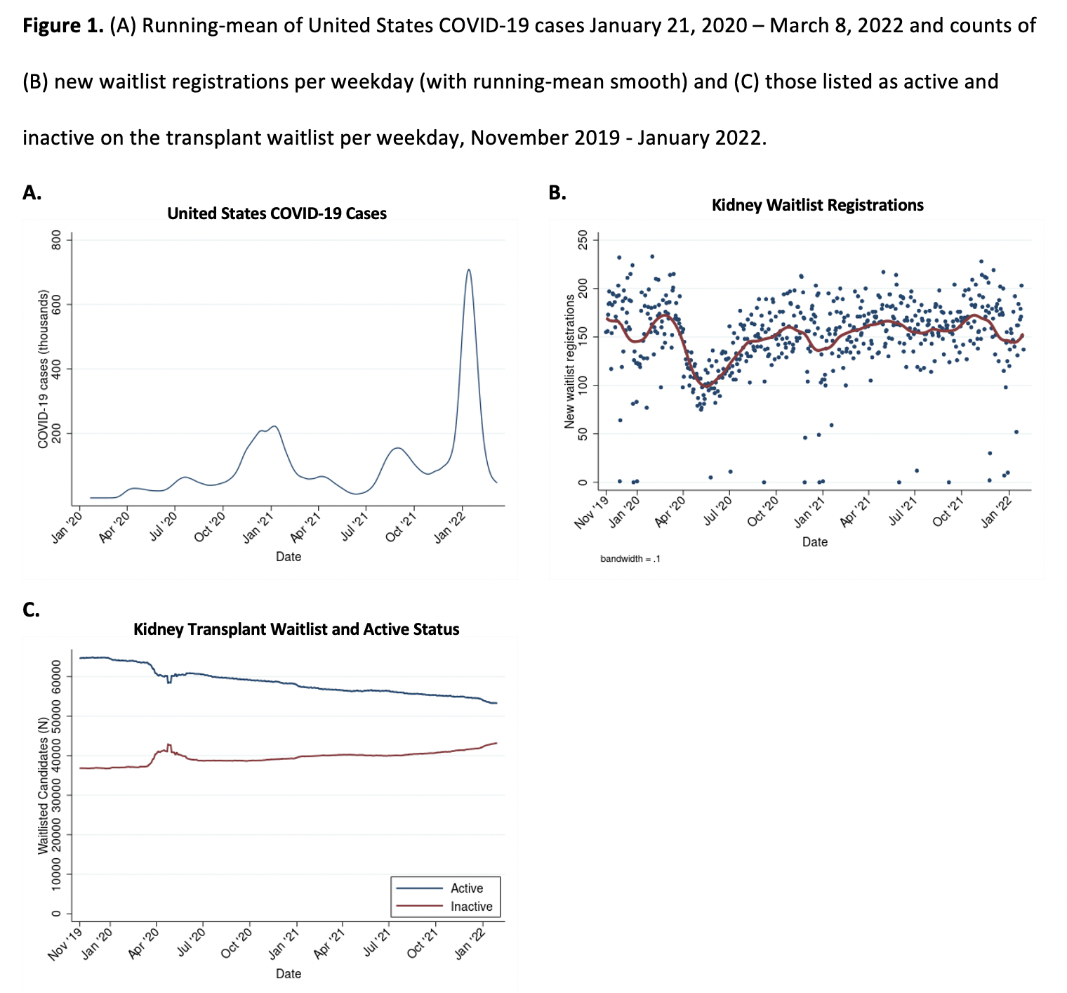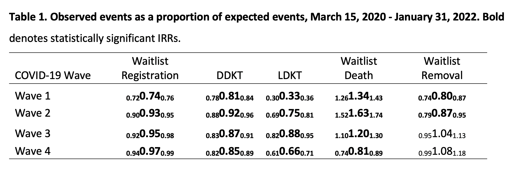 Methods: Using data from the Scientific Registry of Transplant Recipients (SRTR), we compared observed waitlist registrations, waitlist mortality, waitlist removal, LDKT, and DDKT in the United States over four distinct pandemic waves to expected events based on calculations from pre-epidemic and non-wave pandemic data, while accounting for seasonality and secular trends. Four distinct time periods/waves of high COVID-19 incidence in the United States were identified for analysis. Wave 1 was defined March 15, 2020 – May 31, 2020; Wave 2 was defined December 1, 2020 – January 31, 2021; Wave 3 was defined August 1, 2021 – September 30, 2021; and Wave 4 was defined December 1, 2021 – January 31, 2022. Waves 1, 2, 3, and 4 were referred to as the Initial, Winter 2021, Delta, and Omicron waves during our analysis.