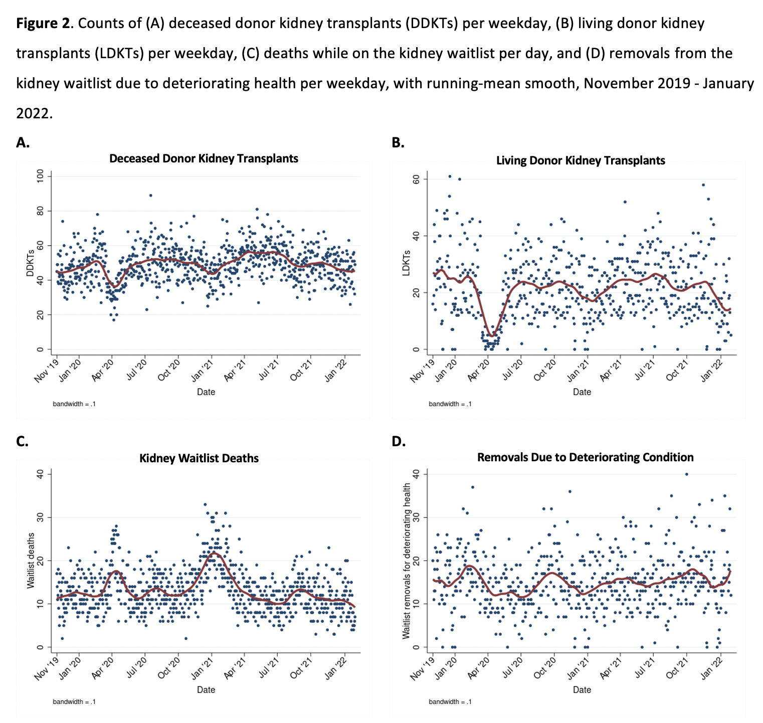Results: Although the number of daily waitlist additions has been increasing since May 2020, the size of the active waitlist has consistently declined, reaching a minimum of 53,180 on 1/31/2022. The recent Omicron surge knocked LDKT from 12% below expected (IRR = 0.820.880.95) during the Delta wave to 34% below expected (IRR = 0.610.660.71). DDKT, in contrast, was relatively unaffected by the Omicron wave (IRR = 0.830.870.91 and 0.820.850.89 during the Delta and Omicron waves, respectively). Waitlist death declined from 20% above expected (IRR = 1.111.201.30) during Delta to 19% below expected (IRR = 0.740.810.89) during Omicron, whereas waitlist removal remained at expected levels throughout both (IRR = 0.951.041.13 and 0.991.081.18 during Delta and Omicron, respectively). Note, this was the first time that an outcome returned to expected levels since the start of the pandemic.