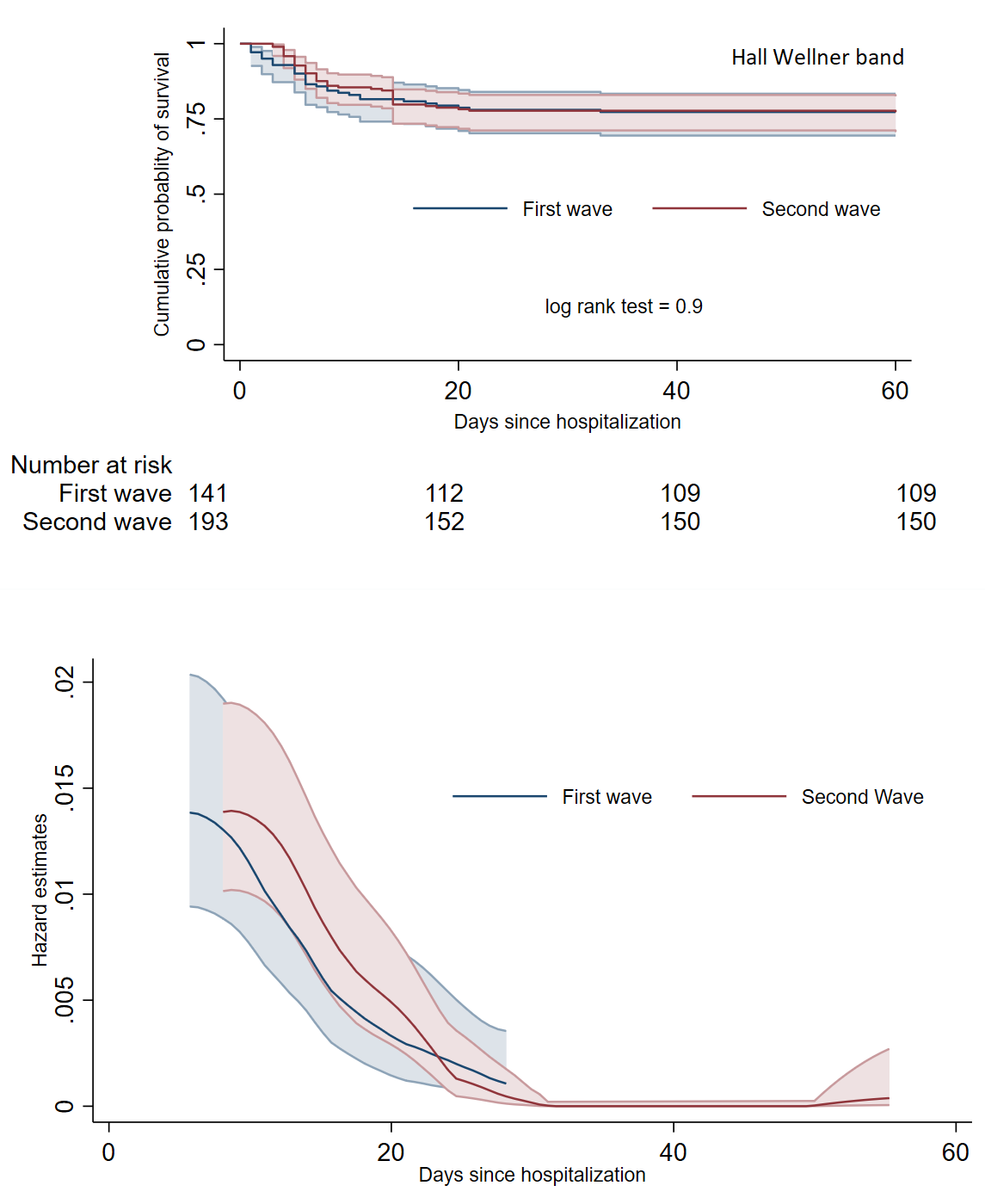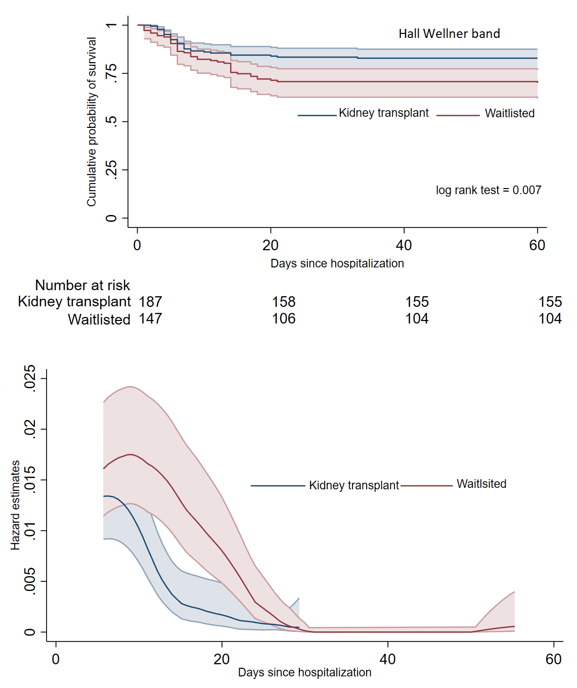 Results: Among the demographic characteristics, waitlisted group had older age [45(35-54) vs 40(32-48); p-value < 0.01] and equal gender distribution (56.4% vs 81.8%; p-value < 0.01) compared to kidney transplant recipients. Overall, waitlisted patients were more symptomatic. The unadjusted 60-day mortality remained same across both the pandemic waves (log rank test, p-value = 0.9) but was higher for waitlisted patients (30.6% vs 17%; log rank test, p-value = 0.007). In a univariable analysis age more than 60 years, waitlist status, hypertension, diabetes, obesity was associated significant mortality. In a multivariate analysis, age (OR = 5.7(2.3-14); p-value < 0.01), hypertension (OR = 11(4.1-28); p-value < 0.01) and diabetes (OR = 2.3(1.1-5); p-value = 0.02) was associated with mortality. In multivariate analysis for prediction of severe disease, only hypertensive cases (OR = 4.8(2.2-10.5; p-value < 0.01) was found having association.