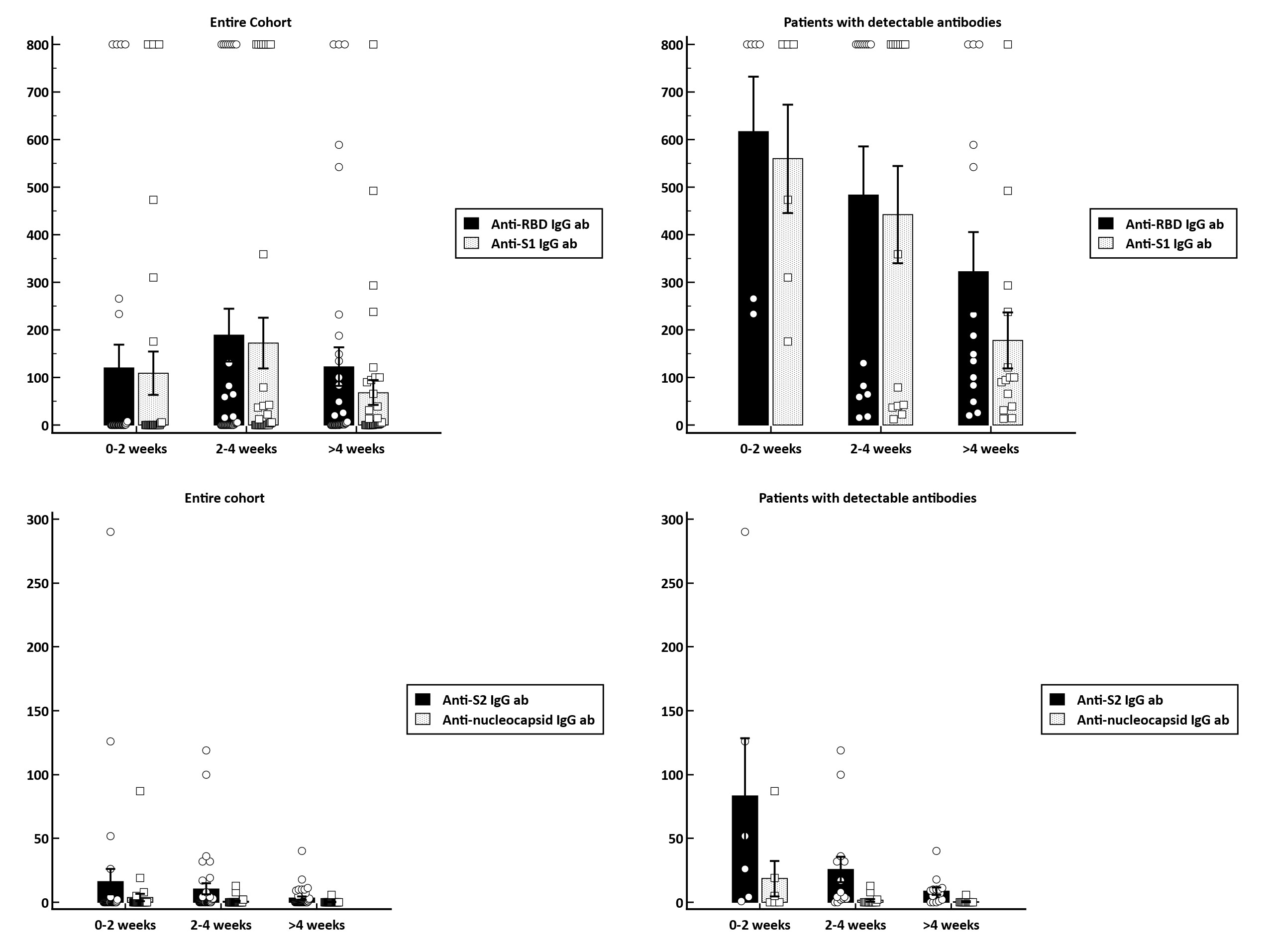Method: Serum samples collected from COVID-19 vaccinated kidney transplant (KT) recipients from 3/1/21-4/26/21 were tested for COVID-19 antibodies using a novel multi-antigen detection Luminex platform (BioRad). We measured the specific anti-SARS-CoV-2 IgG antibodies against the individual components of the trimeric spike protein, namely spike 1 (S1), spike 2 (S2) and receptor-binding domains (RBDs). In addition, documentation of previous infection was assessed by measuring anti-nucleocapsid antibodies.